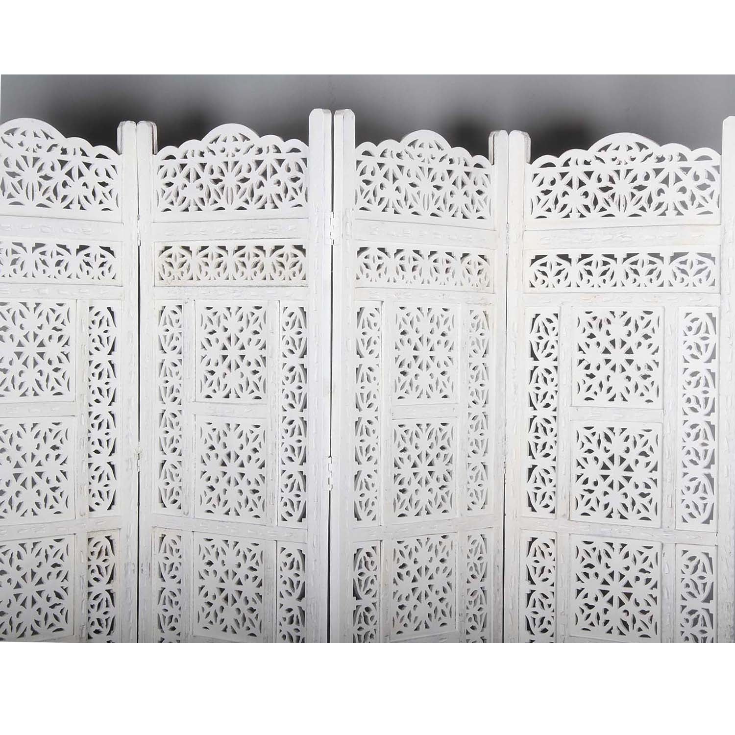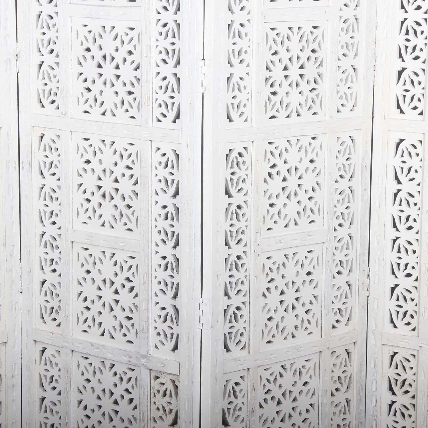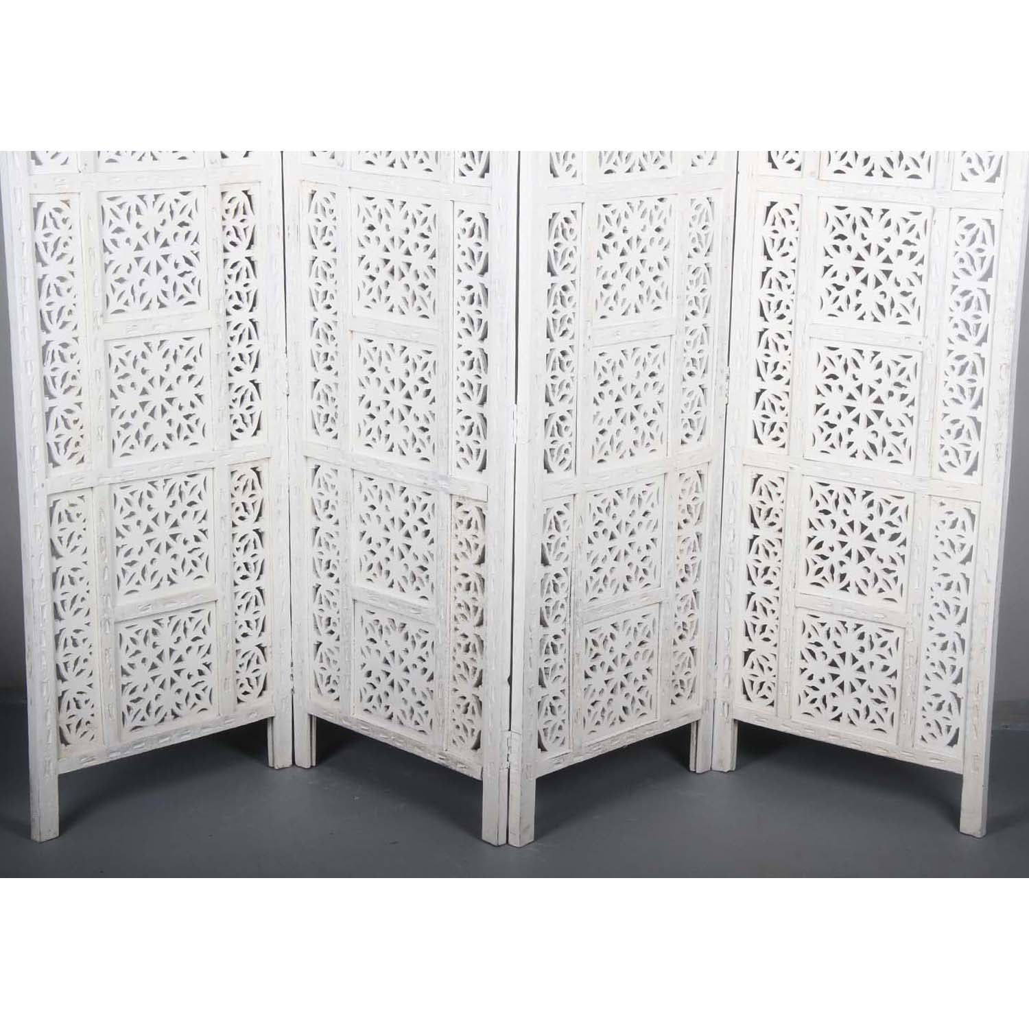 Het Indiase kamerscherm Elyes is met de hand gesneden uit mangohout en MDF-hout en is versierd met traditionele bloemmotieven. Het bestaat uit vier panelen. Het kamerscherm met zijn elegante witte panelen past bij vrijwel elke interieurstijl. Deze ruimteverdeler is een moderne en elegante oplossing om uw woonruimte naar wens in te delen.