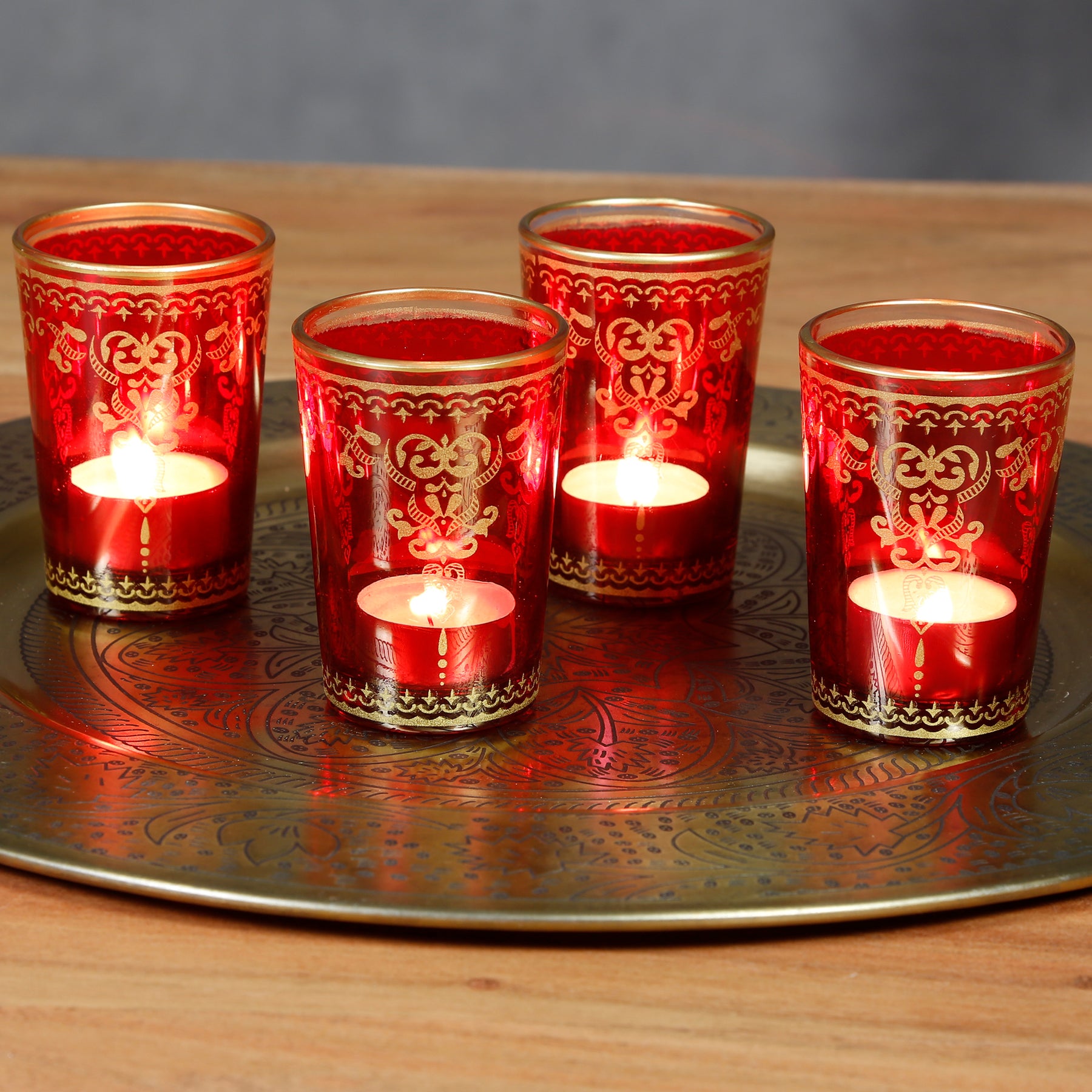 Geef je huis een bijzondere esthetische kamerdecoratie met deze decoratieve kaarsglazen in rood-goud – ideaal voor gezellige avonden of als tafeldecoratie.