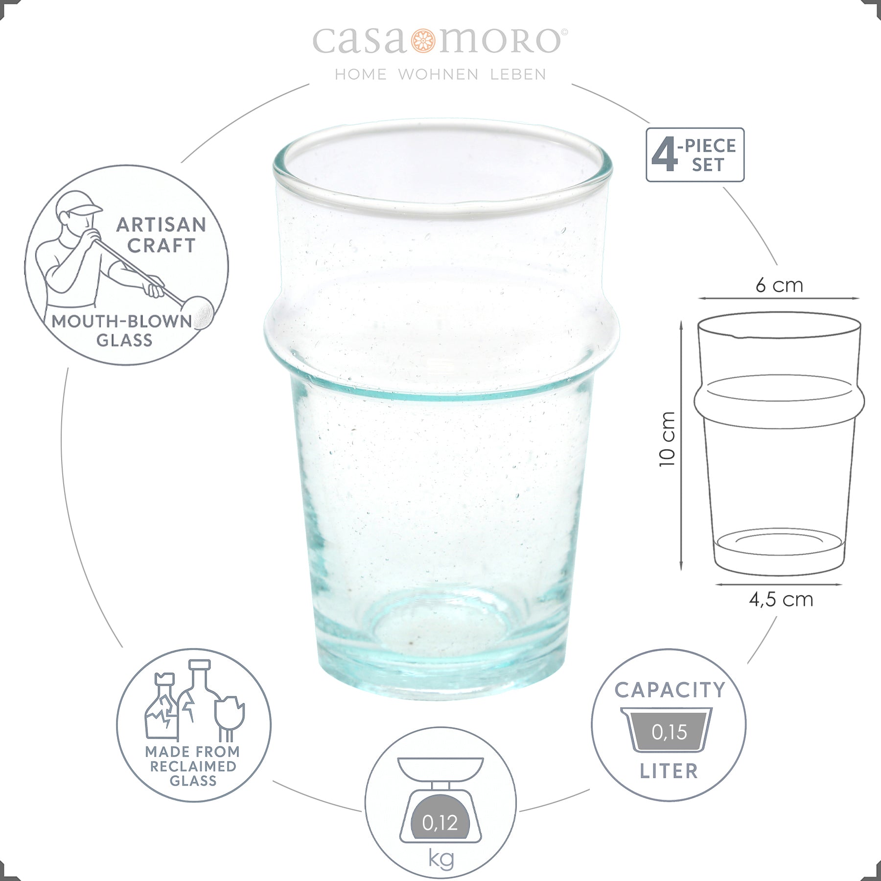 De glazen zijn mondgeblazen van gerecycled glas. Kleine belletjes en fijne onregelmatigheden maken elk stuk tot een stijlvol uniek stuk. De heldere uitstraling past harmonieus in elke tafelcultuur - van minimalistisch ontbijt tot feestelijke diners.