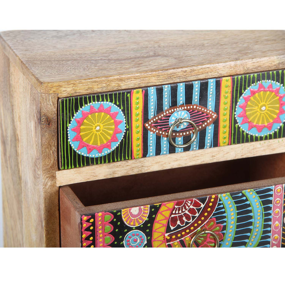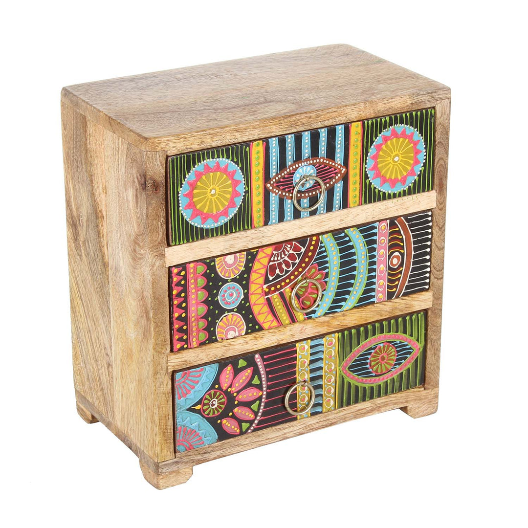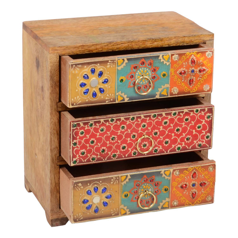 Ze zijn gemaakt van massief mangohout of teakhout en brengen warmte, kleur en ambachtelijke diepgang in elke kamer. De oppervlakken zijn deels zorgvuldig gesneden, deels liefdevol beschilderd – vaak in meerdere lagen met gedetailleerde ornamenten, bloemmotieven of kleurrijke symbolen. Geen enkel stuk is hetzelfde – elk kistje vertelt zijn eigen verhaal.