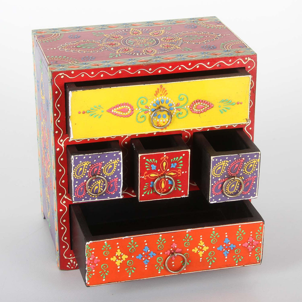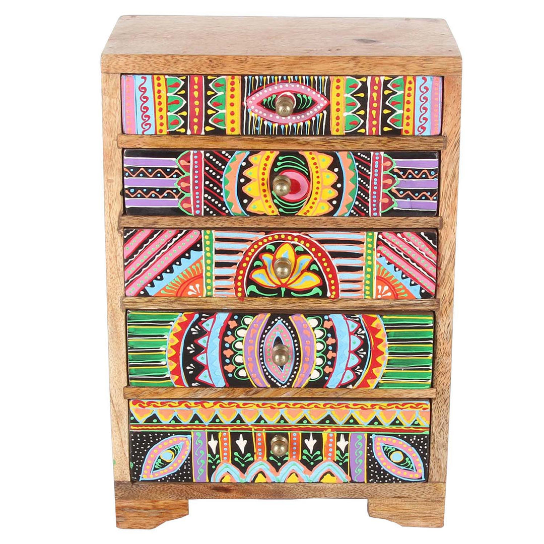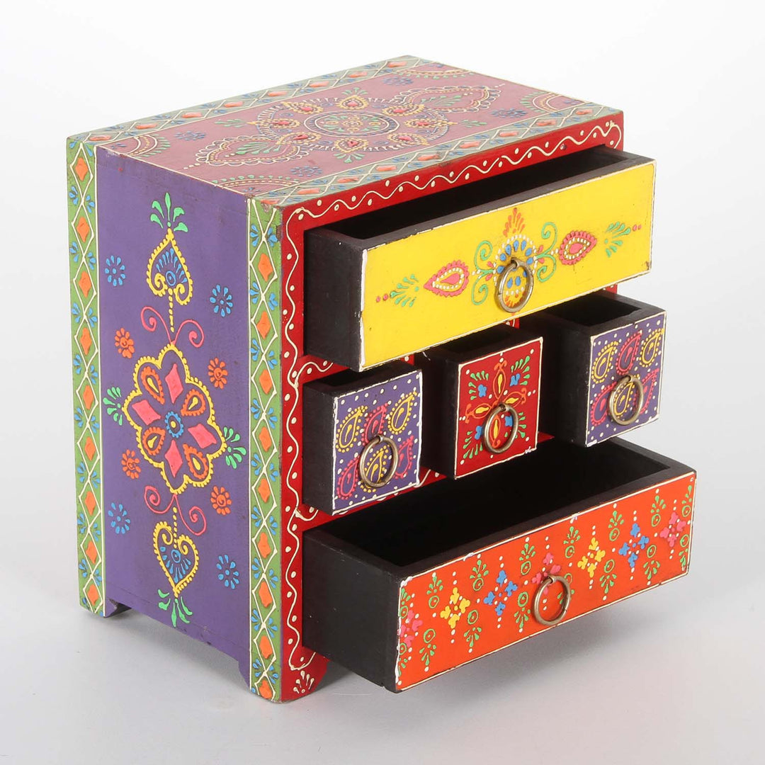 Ze zijn gemaakt van massief mangohout of teakhout en brengen warmte, kleur en ambachtelijke diepgang in elke kamer. De oppervlakken zijn deels zorgvuldig gesneden, deels liefdevol beschilderd – vaak in meerdere lagen met gedetailleerde ornamenten, bloemmotieven of kleurrijke symbolen. Geen enkel stuk is hetzelfde – elk kistje vertelt zijn eigen verhaal.