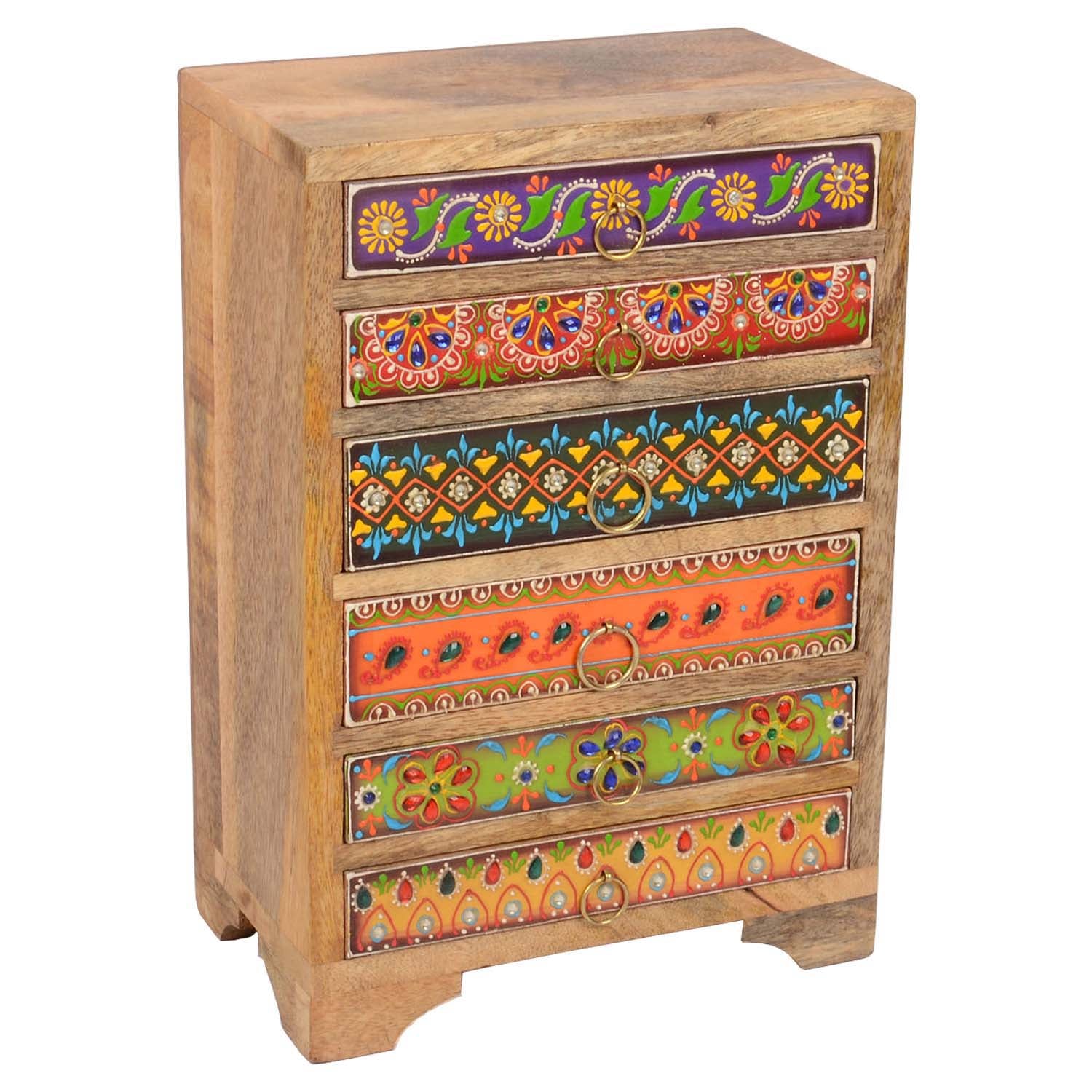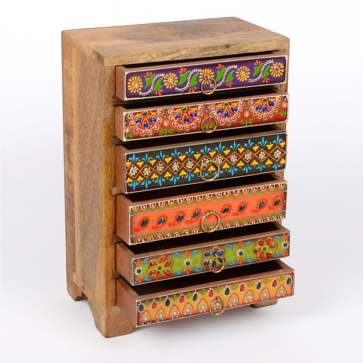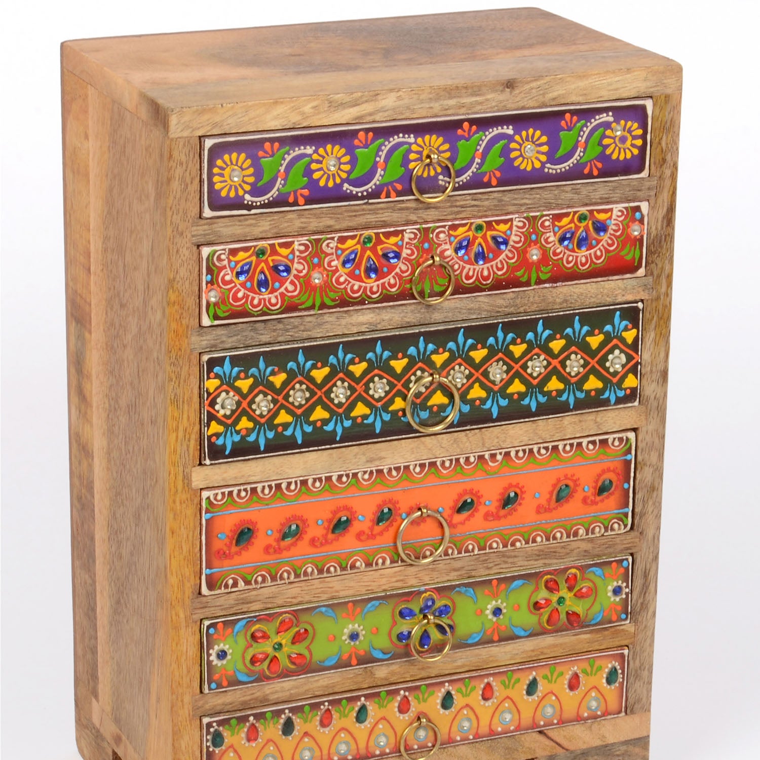 Een prachtig handgeschilderd en versierd ladekastje dat elke kamer verrijkt met zijn unieke karakter. Elk vakje is met liefde en individueel met de hand ontworpen, geen enkel vakje is hetzelfde.