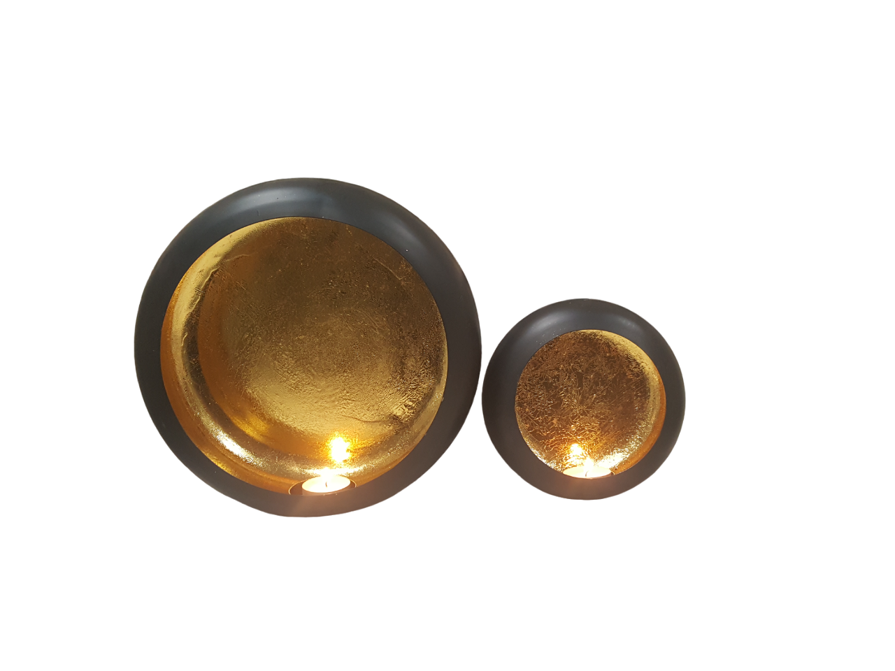 De ronde wandkaarsenhouders zijn aan de buitenkant zwart gelakt en aan de binnenkant bekleed met goudfolie, waardoor de ondergrond er "gekreukt" uitziet. Het kaarslicht wordt meerdere keren gebroken, waardoor de theelichthouders warmte en vriendelijkheid uitstralen en een sfeervolle atmosfeer creëren – ideaal voor avonden met z'n tweeën, met vrienden en familie.