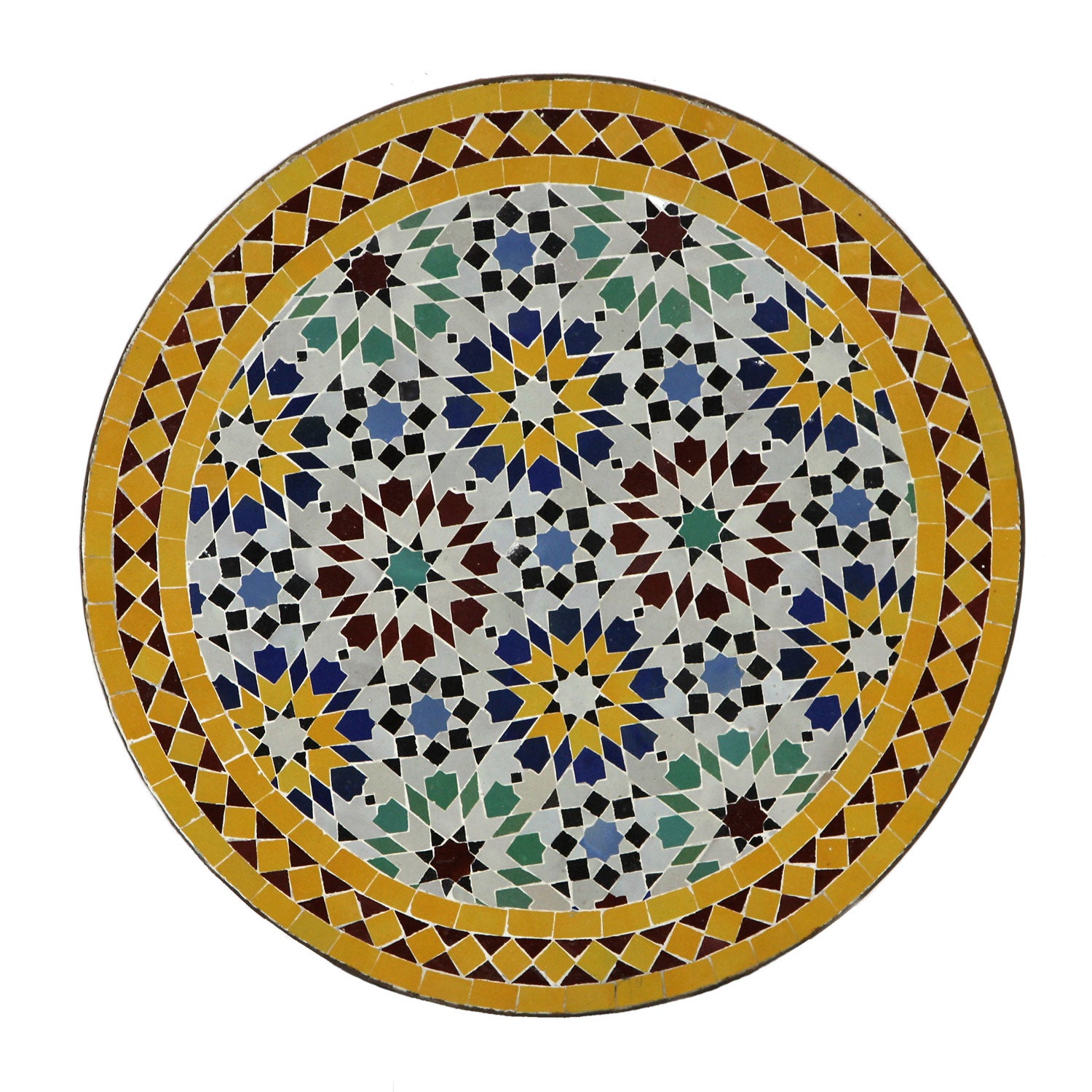 Een ruitvormige rand is typisch voor een Marokkaanse mozaïektafel. Deze rand heeft naast een decoratieve ook een symbolische functie: als gestileerde ogen (heksenogen) moeten vierkante ruiten mensen beschermen tegen alle soorten onheil. In deze rand leggen de mozaïekleggers de meest uiteenlopende patronen en ornamenten. Eén ding is echter altijd hetzelfde: de geglazuurde mozaïekstukjes worden vooraf met een scherpe hamer uit de ambachtelijk vervaardigde zellige-tegels gehouwen. Elk tafelblad is puur handwerk en daarmee absoluut uniek.