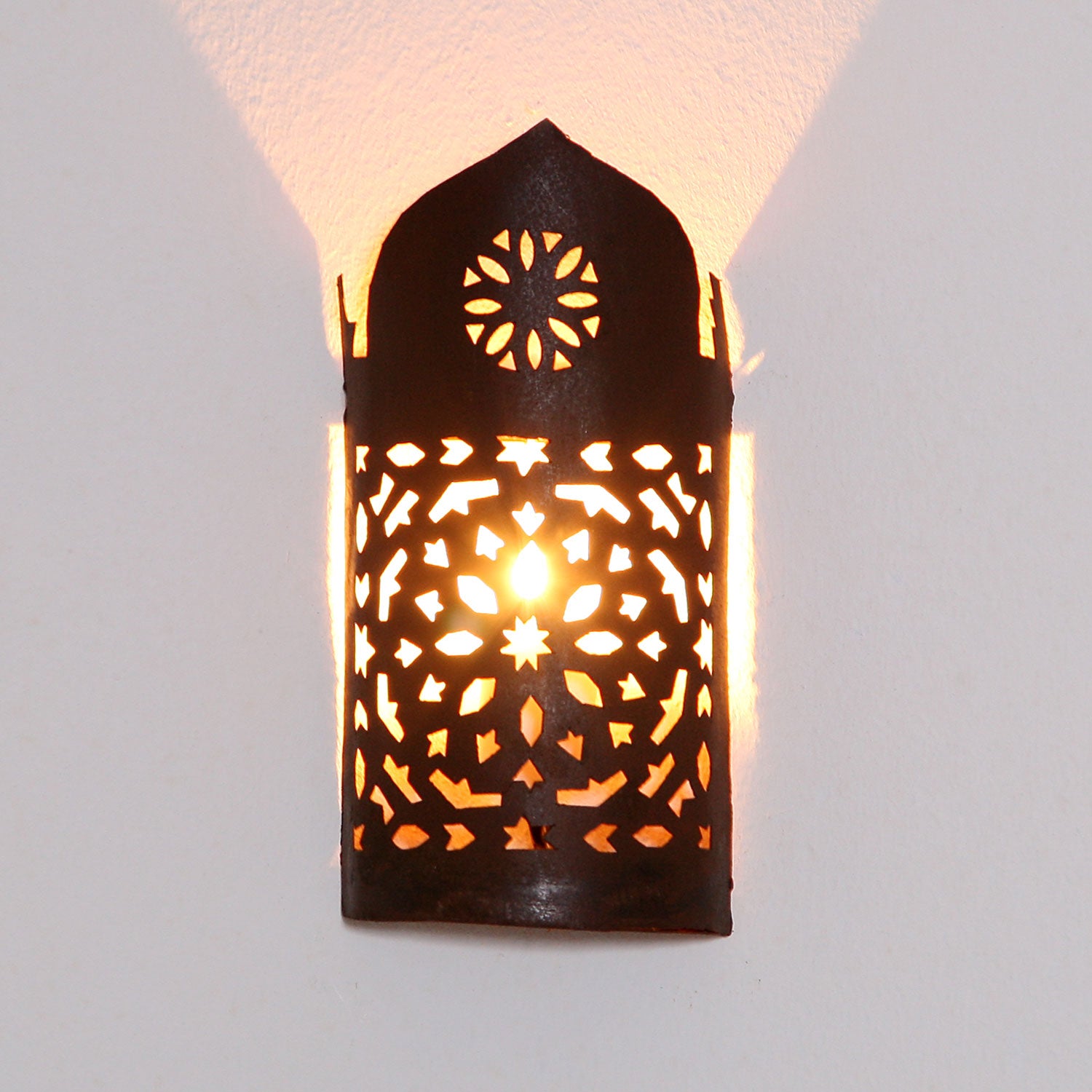 "Marokkaanse wandlantaarns van dit type hebben een unieke licht- en schaduwval. Door de talloze uitsparingen breekt het licht in vele kleine puntjes en creëert zo een dromerige sfeer."