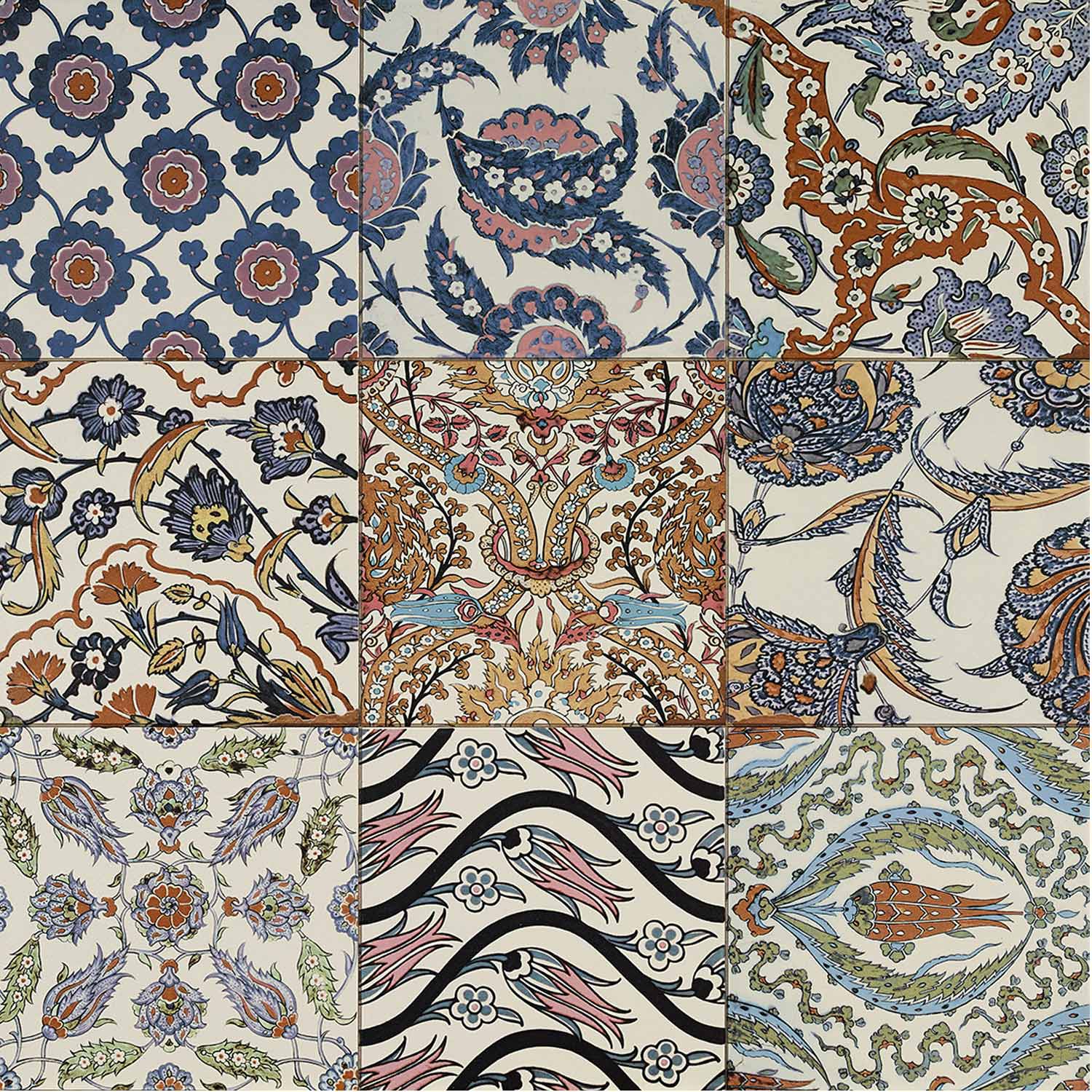 Im Format 59,2 x 20 cm wirken die Muster wie textile Paneele an der Wand. Florale Motive, geometrische Elemente und orientalische Formen verschmelzen zu einem dekorativen Gesamtbild mit Tiefe. Die matte Oberfläche unterstreicht den hochwertigen Charakter und lässt die Farben ruhig und edel erscheinen.