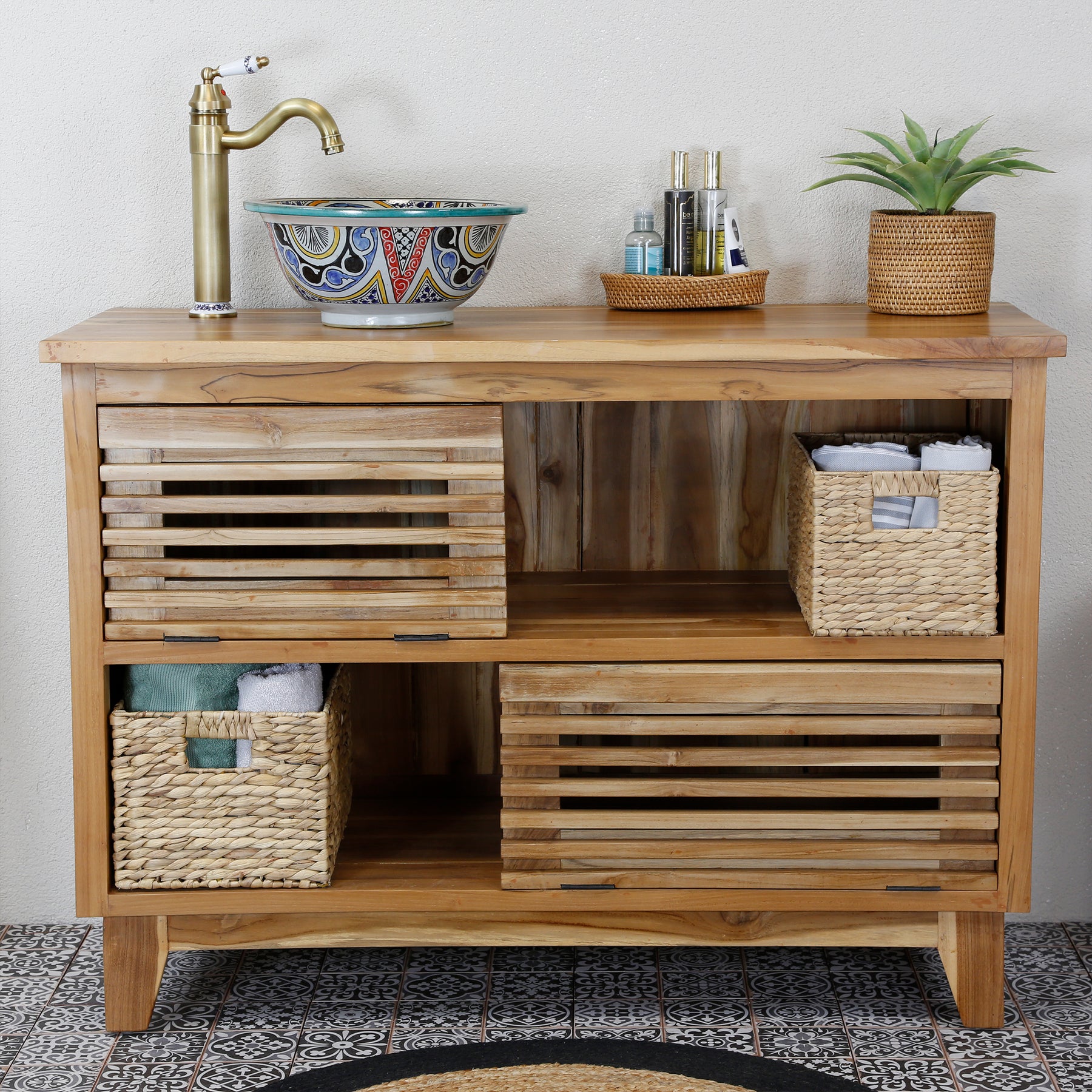 Ob auf einem Waschtisch aus Holz, Stein oder Beton – dieses farbenfrohe Aufsatzbecken bringt marokkanisches Flair in jedes Badezimmer oder Gäste-WC. Es verbindet jahrhundertealte Handwerkskunst mit moderner Eleganz – ideal für individuelle Badgestaltungen.