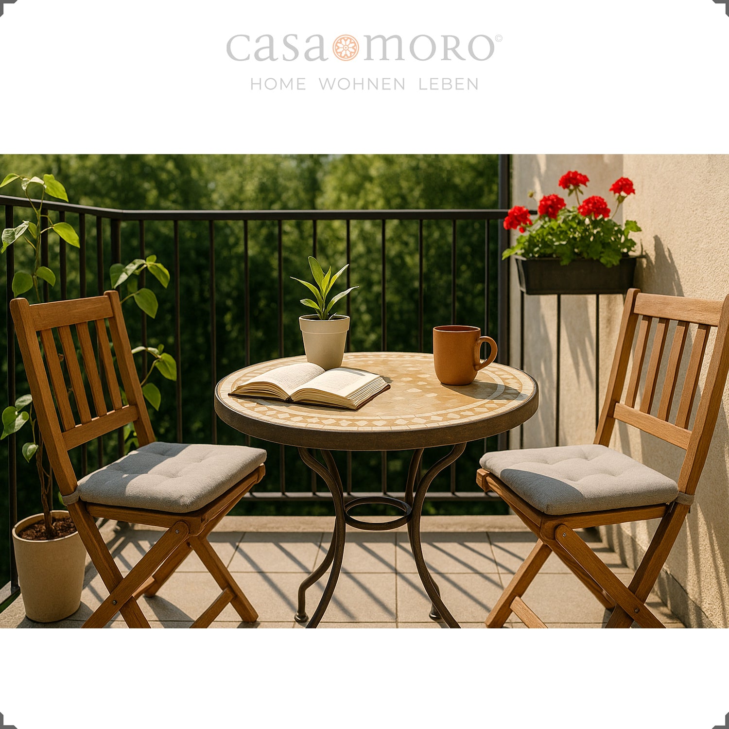 Die Mosaikplatte (ca. 18 kg) liegt sicher und ohne Verschraubung auf dem formschönen Tischgestell aus Metall. Ein Mosaiktisch, der flexibel aufgestellt werden kann – ob als kompakter Balkontisch, dekorativer Fliesen-Tisch oder praktischer Terrassentisch.