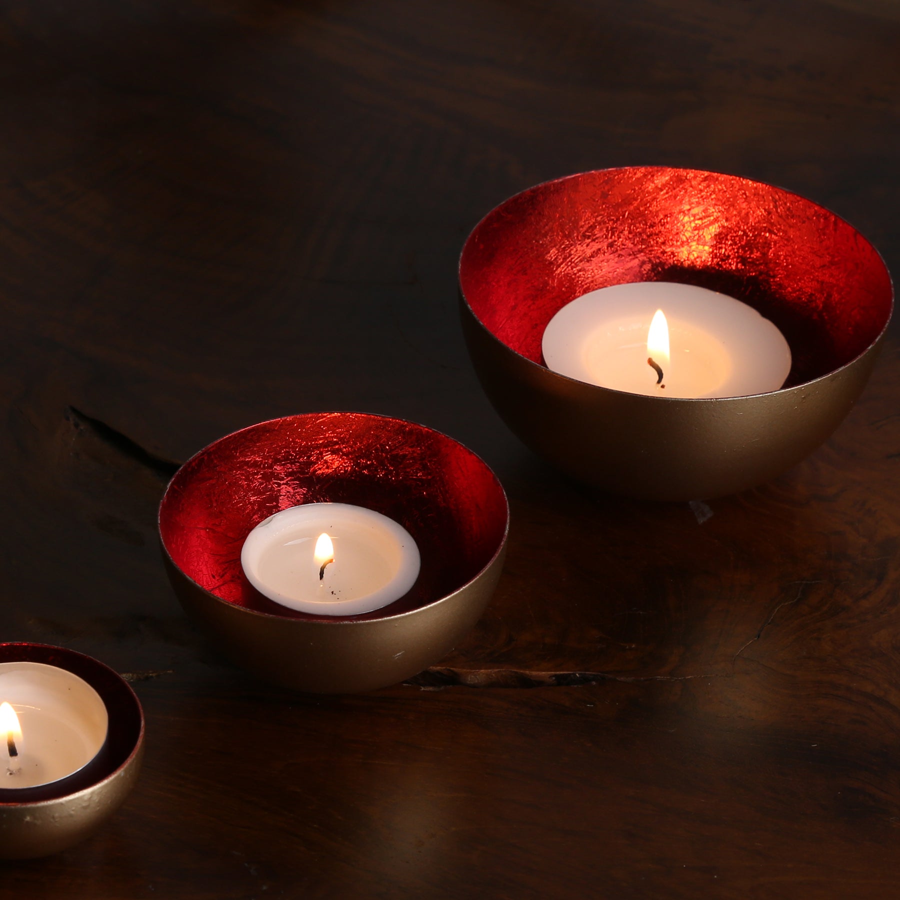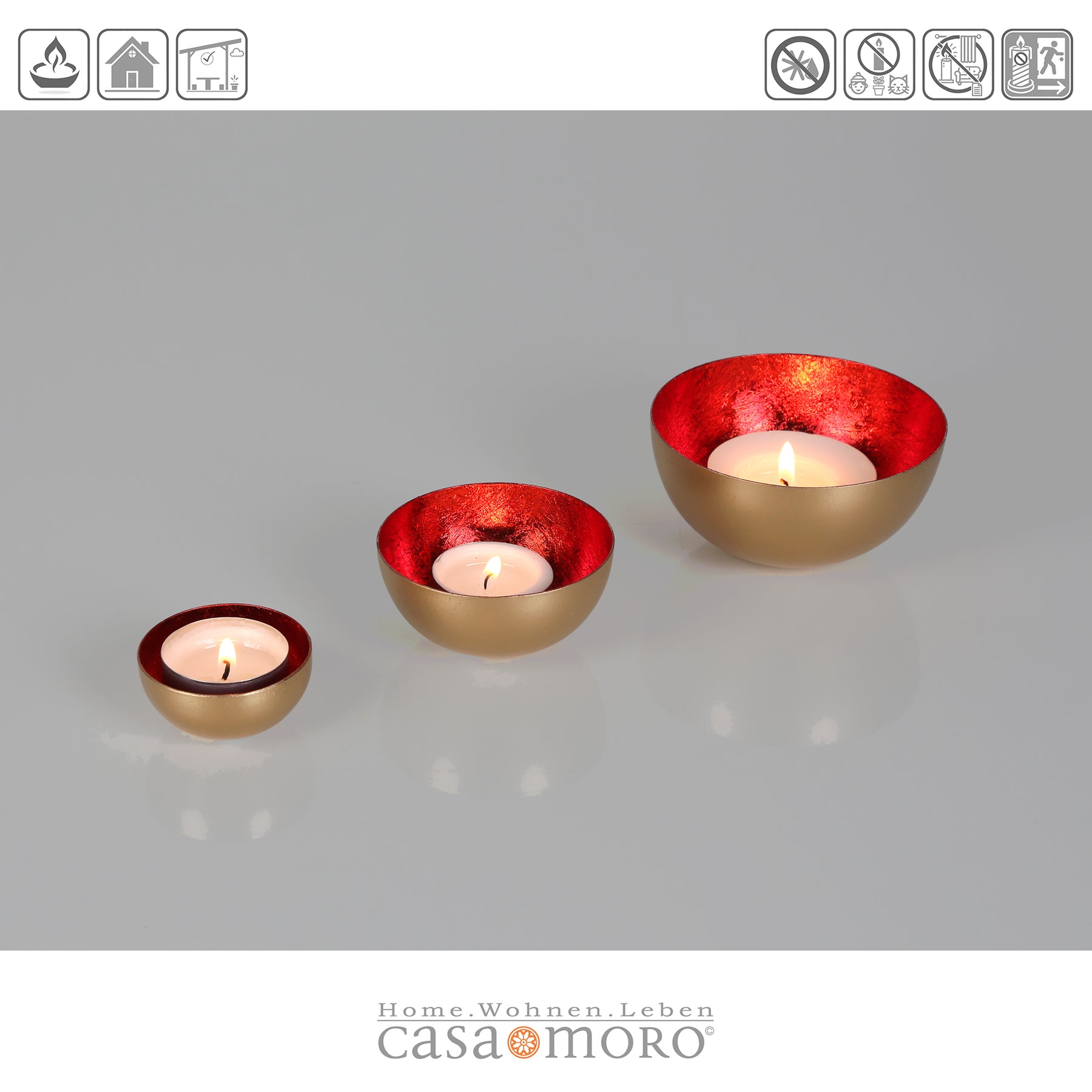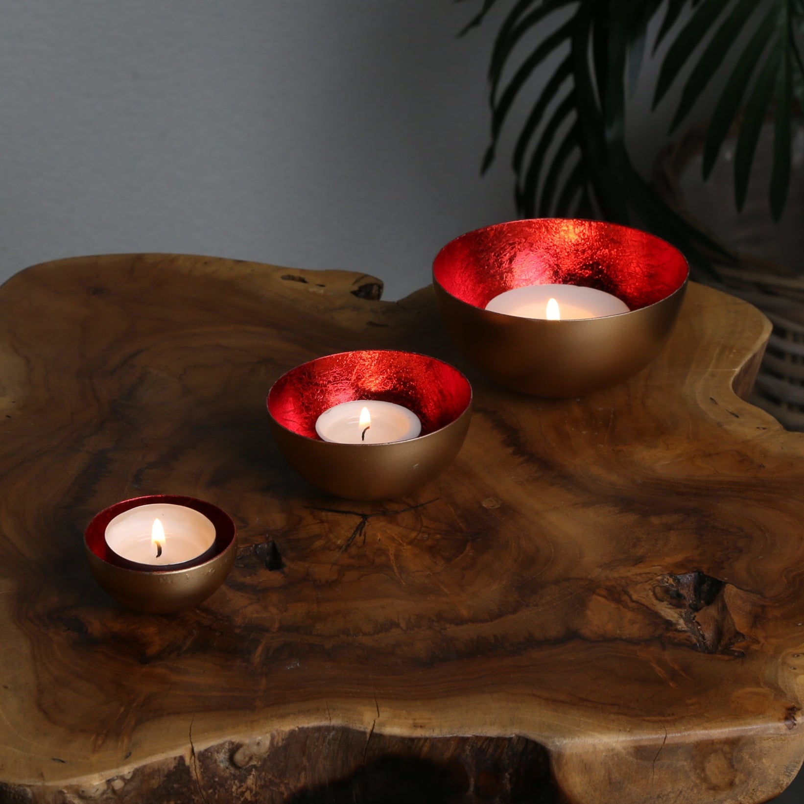 Goldene Schalen, roter Glanz. Das elegante Set besteht aus drei unterschiedlich großen Teelicht-Schalen, die aus robustem Metall gefertigt und von Hand veredelt wurden. Die Außenseite strahlt in einem edlen Goldton, während die Innenseite mit einem kräftigen Rot verziert ist. Ein luxuriöser Blickfang, der Deine Wohnräume aufwertet!
