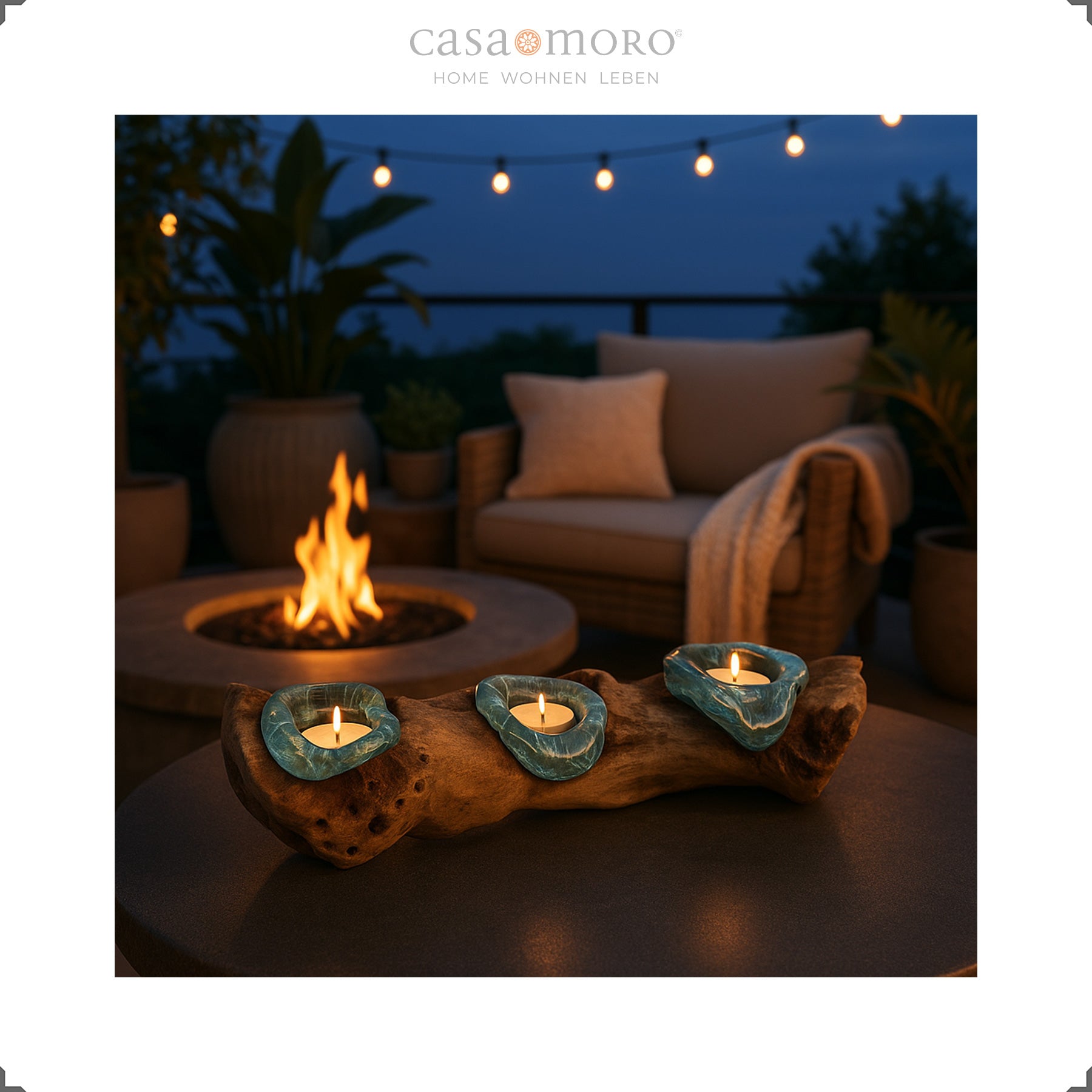 Teelichthalter aus Glas und Wurzelholz auf einer Terrasse bei Dämmerung, umgeben von Feuerstelle und Boho-Outdoordekor