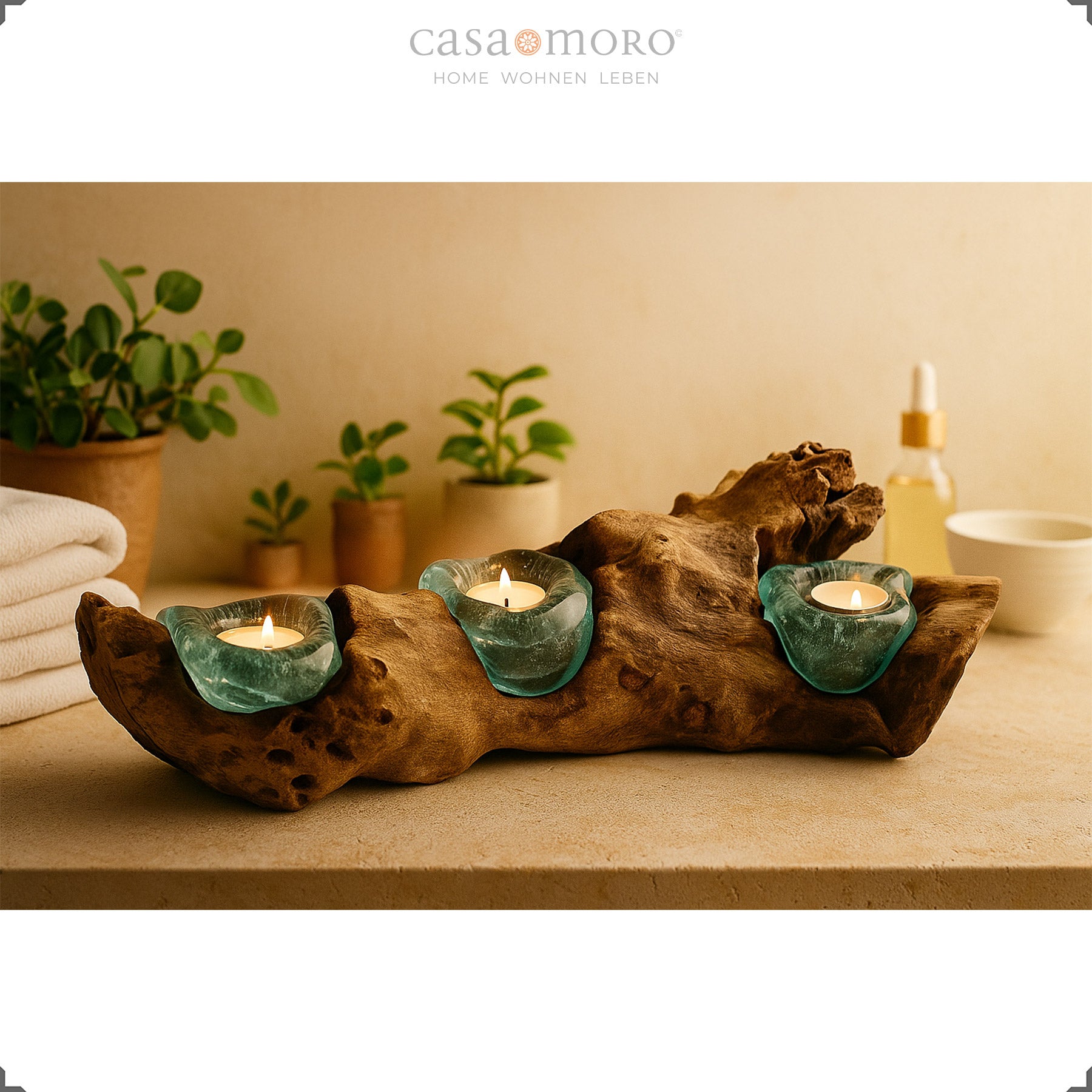 Dreiteiliger Teelichthalter aus Wurzelholz und türkisfarbenem Glas auf einer Badezimmerablage, umgeben von Pflanzen und Handtüchern