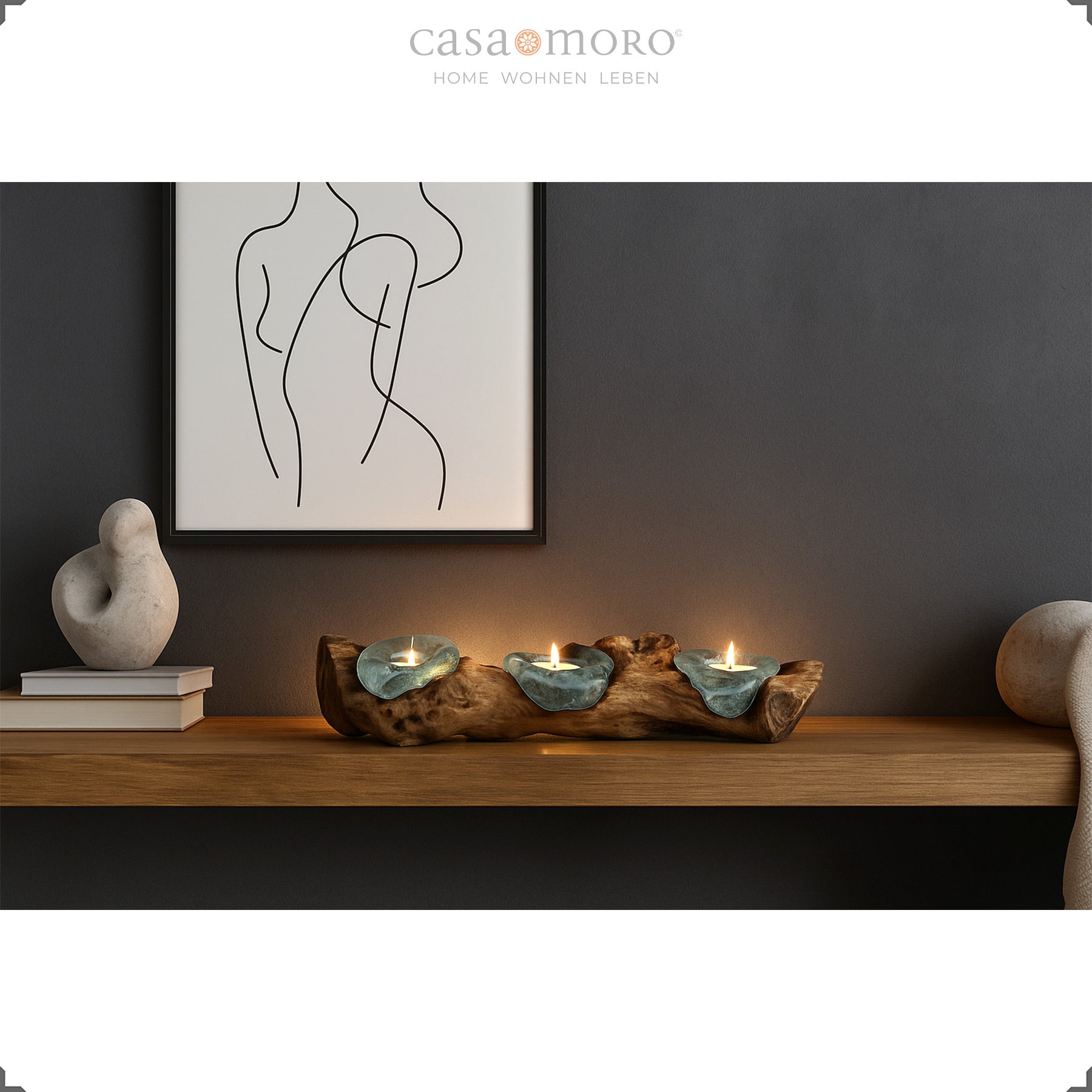 Dreiteiliger Teelichthalter aus Glas und Wurzelholz auf einer Holzkommode, warmes Licht im modernen Wohnzimmer