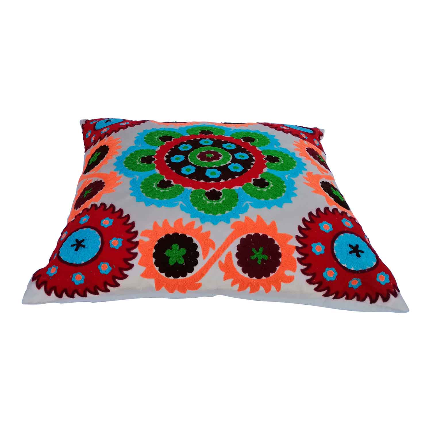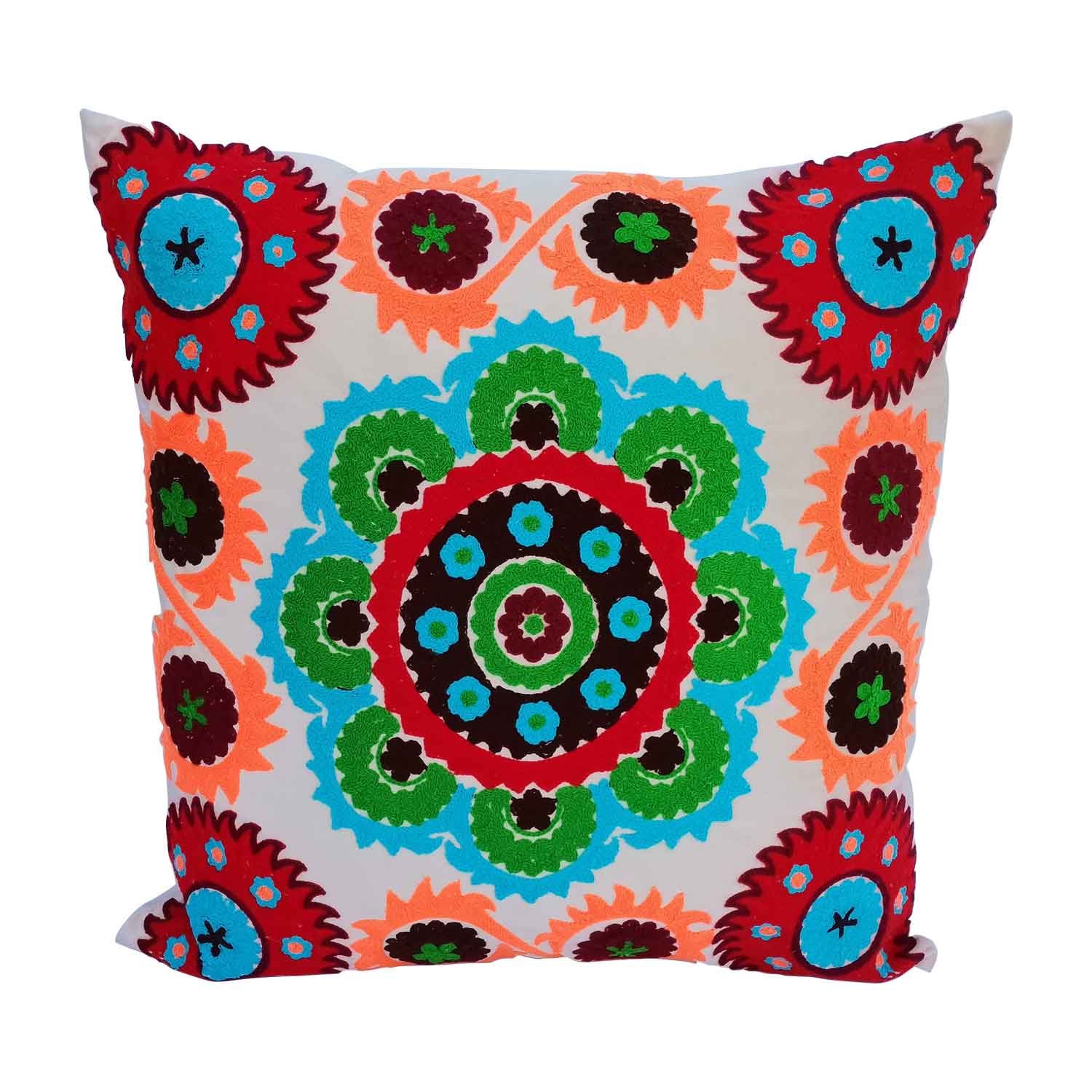Das bestickte orientalische Mandala Kissen Kera ist mit abstrakten floralen Ornamenten in kräftigen Farben von Hand bestickt, dadurch erhalten garantiert ein Unikat. Mit diesem kuscheligen Couchkissen setzen Sie nicht nur fröhliche Akzente in jeden Wohnraum, sie haben gleichzeitig einen Blickfang, dem sich keiner entziehen kann.