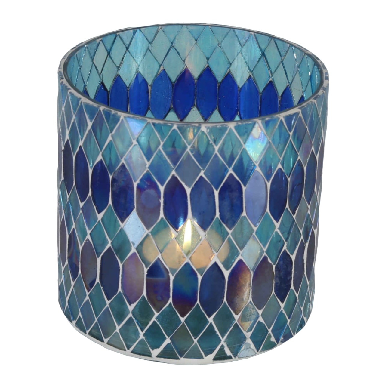 Dekoratives Mosaik Glas-Windlicht, Teelichthalter Rayan Dunkelblau. Die bunten Gläser sind außen mit kleinen Mosaik-Glassteinchen von Hand beschmückt, dadurch ist jedes Mosaik Glaswindlicht ein Unikat. Egal ob im Wohnzimmer als Tischdeko, auf der Terrasse als Gartenwindlicht, oder im Schlafzimmer als Stimmungslicht, oder als Kerzenständer in Ihrem Restaurant, Hotel, oder Lounge - die Mosaik-Windlichter sorgen immer für eine stimmungsvolle Atmosphäre und avancieren zum Deko-Highlight, dem sich keiner entziehen kann.