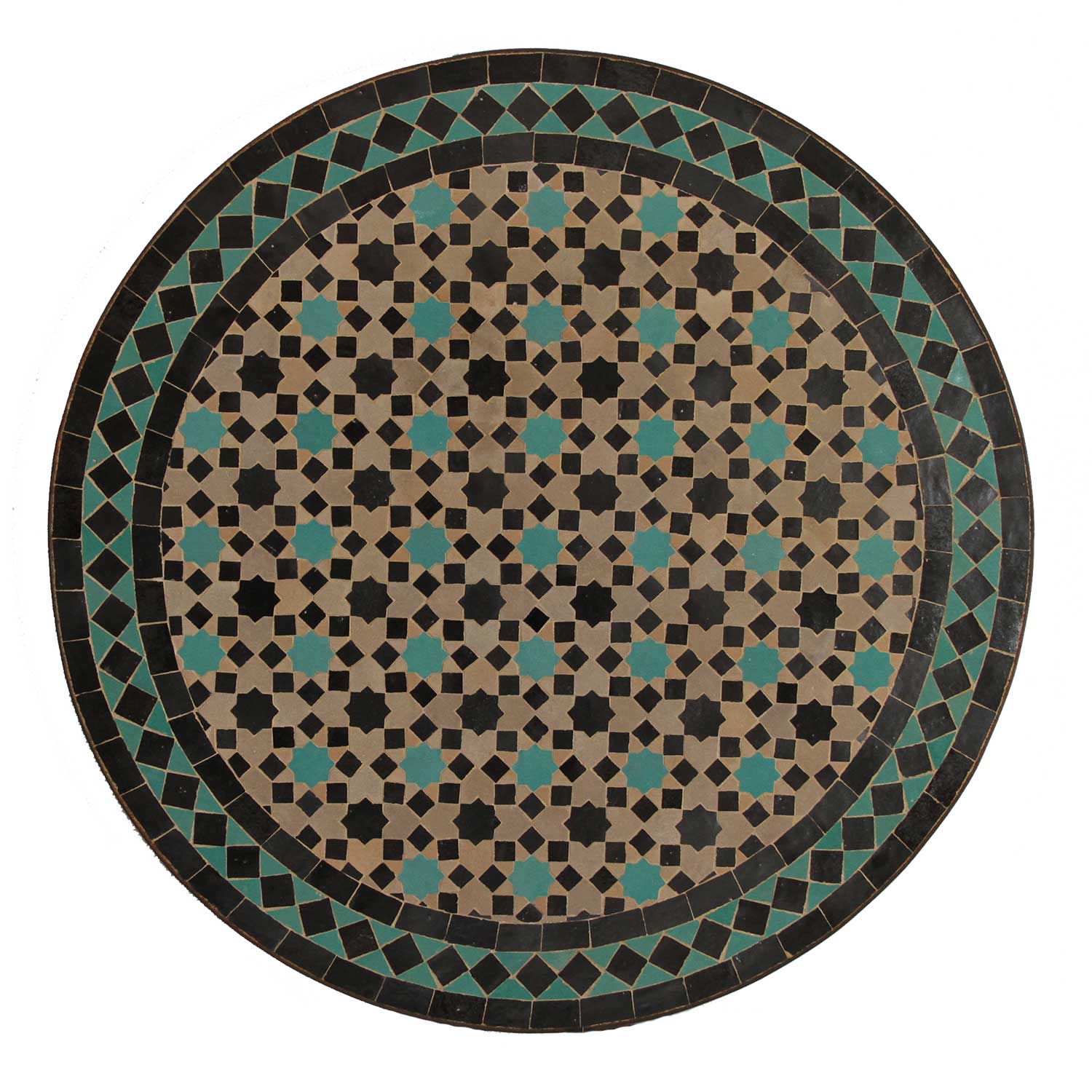Schwarz und Türkis – das schafft Spannung: Die eine Farbe ist geheimnisvoll, die andere lebensfroh wie Urlaub in der Karibik. Im Innenfeld dieses Mosaiktisches erhalten die Sterne und Rauten aus glasierten Zellige-Fliesen einen ruhigen Fond aus  unglasierten Ton-Fliesen. So tritt das glänzende Zweifarben-Mosaik noch stärker in Erscheinung. Umgeben von dunklen Sitzmöbeln und Polstern, wird dieser Gartentisch zu einem wundervollen Blickfang. Damit er zum Paradiesvogel wird, sollte ihm etwas Sonne vergönnt sein.