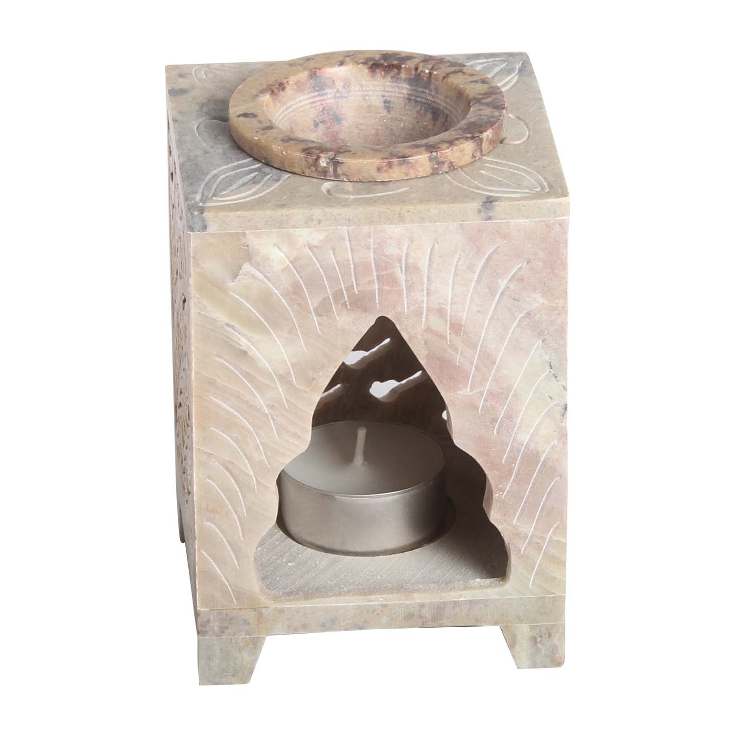 Handgefertigte Duftlampe Shiva aus Soapstone für Teelichtkerzen. Die filigranen Ornamente wurden traditionell von Hand in den Stein gearbeitet. Sowohl als Aroma-Lampe in der Aromatherapie auch als dekorativer Teelichthalter macht unsere Duftlampe eine gute Figur, und schafft mit Ihren Schattenwürfen eine erholsame Atmosphäre. Gemeinsam mit aromatischen Duftölen erzeugt sie eine behagliche Stimmung. Perfekt für Ihre Meditation Stunde, Yoga oder Spa.