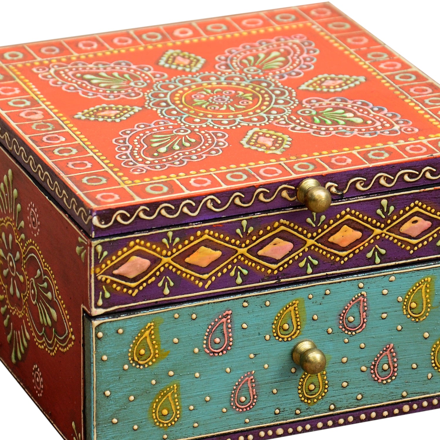 Orientalischer Schmuckkasten Shanti aus massivem Mangoholz. Ein wunderschönes handbemaltes und verziertes Schubfachschränkchen, dass jedes Zimmer mit seiner Einzigartigkeit bereichert.