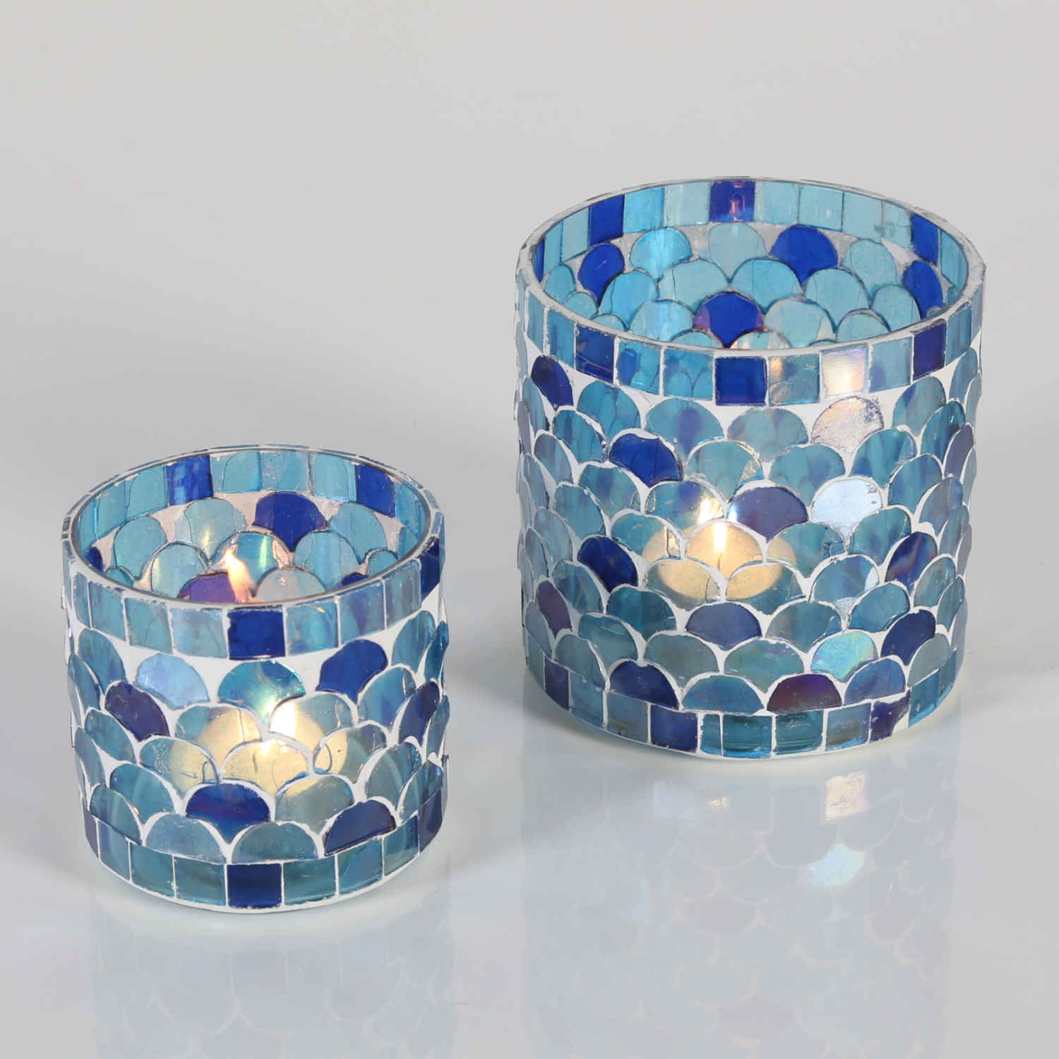 Dekoratives Mosaik Glas-Windlicht, Teelichthalter. Die bunten Gläser sind außen mit kleinen Mosaik-Glassteinchen von Hand beschmückt, dadurch ist jedes Mosaik Glaswindlicht ein Unikat. Egal ob im Wohnzimmer als Tischdeko, auf der Terrasse als Gartenwindlicht, oder im Schlafzimmer als Stimmungslicht, oder als Kerzenständer in Ihrem Restaurant, Hotel, oder Lounge - die Mosaik-Windlichter sorgen immer für eine stimmungsvolle Atmosphäre und avancieren zum Deko-Highlight, dem sich keiner entziehen kann.