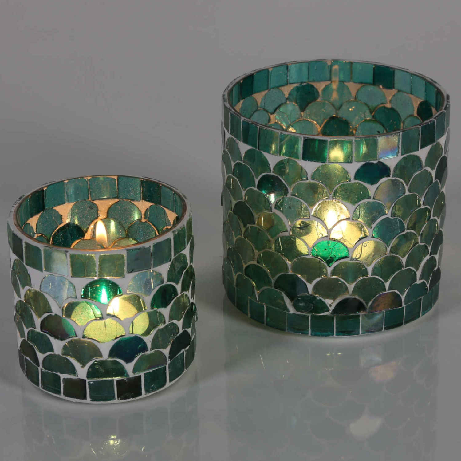 Dekoratives Mosaik Glas-Windlicht, Teelichthalter. Die bunten Gläser sind außen mit kleinen Mosaik-Glassteinchen von Hand beschmückt, dadurch ist jedes Mosaik Glaswindlicht ein Unikat. Egal ob im Wohnzimmer als Tischdeko, auf der Terrasse als Gartenwindlicht, oder im Schlafzimmer als Stimmungslicht, oder als Kerzenständer in Ihrem Restaurant, Hotel, oder Lounge - die Mosaik-Windlichter sorgen immer für eine stimmungsvolle Atmosphäre und avancieren zum Deko-Highlight, dem sich keiner entziehen kann.
