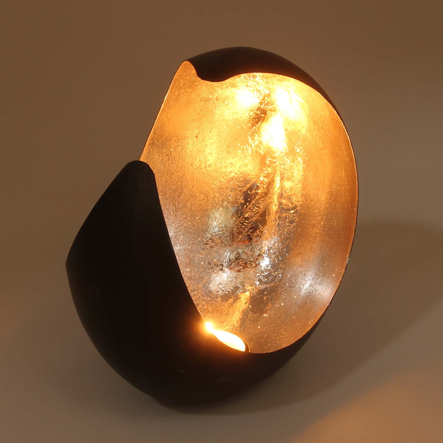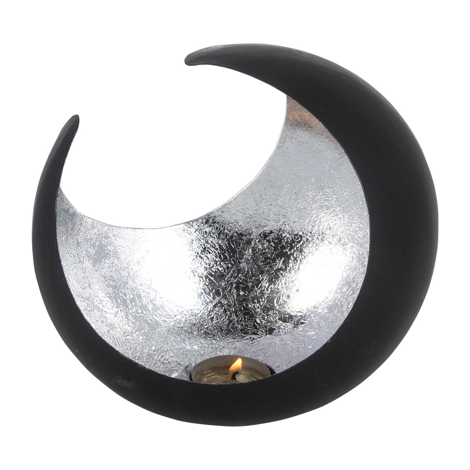 Dekoratives orientalisches Windlicht Ravi Silber passt durch das marokkanische Halbmond Design (auf arabisch Hilal) perfekt in jedes Wohnzimmer. Es wurde liebevoll per Hand gefertigt, somit Sie jedes Stück ein echtes Unikat! Der orientalische Teelichthalter ist außen in Schwarz lackiert und innen mit Silberfolie ausgekleidet, dadurch wirkt der Untergrund "verknittert", und bricht das Kerzenlicht mehrfach. Das orientalische Windlicht Ravi Silber strahlt Wärme und Freundlichkeit aus und verbreitet eine stimmungsvolle Atmosphäre – Ideal für Abende zu zweit, mit Freunden und der Familie.