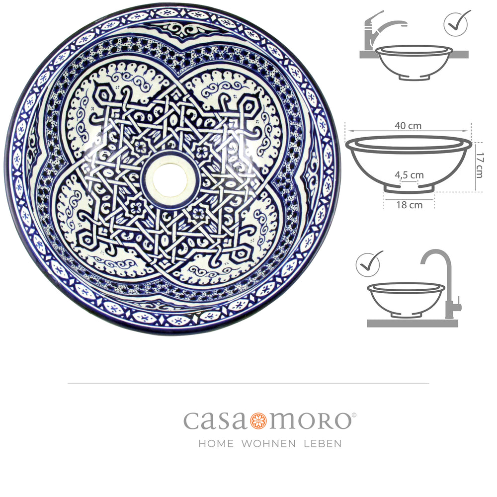 Chaque lavabo en céramique est soigneusement peint à la main. Les motifs et les couleurs reflètent la riche ornementation mauresque : de délicats motifs géométriques, des vrilles courbes et des motifs arabesques se fondent dans un ensemble harmonieux. Le bleu classique de Fès domine souvent sur les glaçures blanches, mais des couleurs vives - du turquoise et du vert au jaune ensoleillé en passant par la terre cuite chaude - sont également utilisées. Le tableau décore l'intérieur et l'extérieur du Lavabo, ce qui crée un jeu de couleurs fascinant sous tous les angles. Il n'y en a donc pas deux pareils Lavabo l'autre; Chaque pièce est une pièce unique de la culture artistique marocaine, peinte à la main.