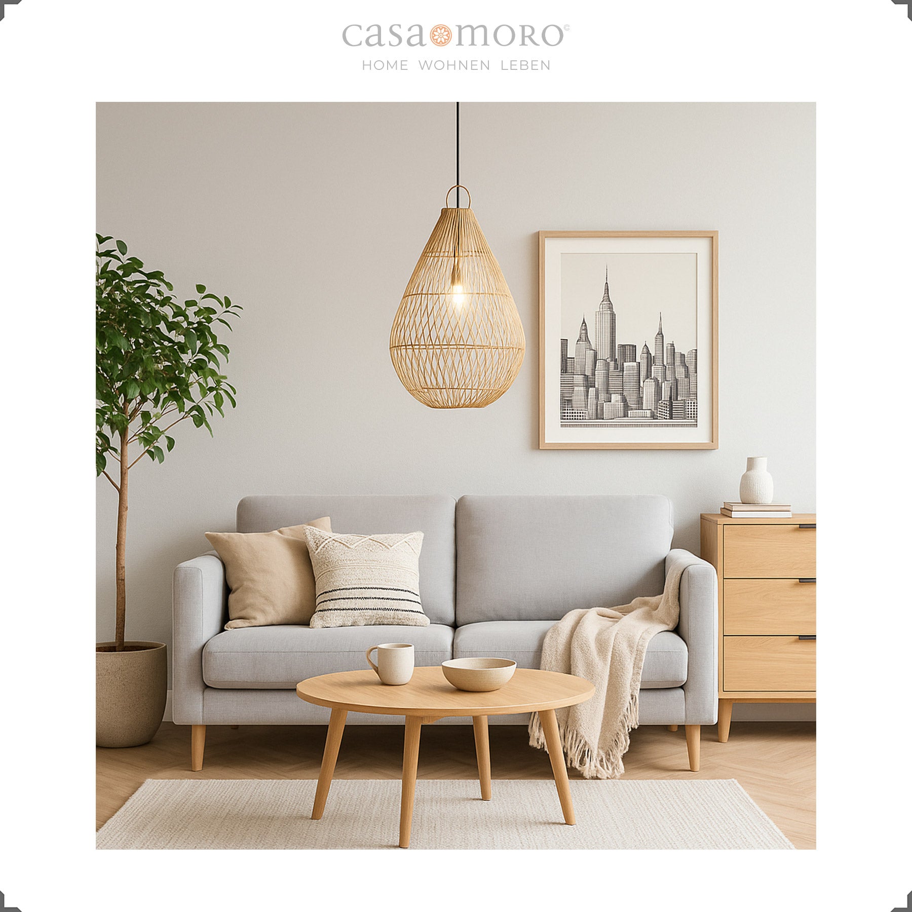 Lampe en rotin en forme de goutte comme lampe suspendue dans le salon, crée une lumière chaude et une atmosphère bohème chaleureuse