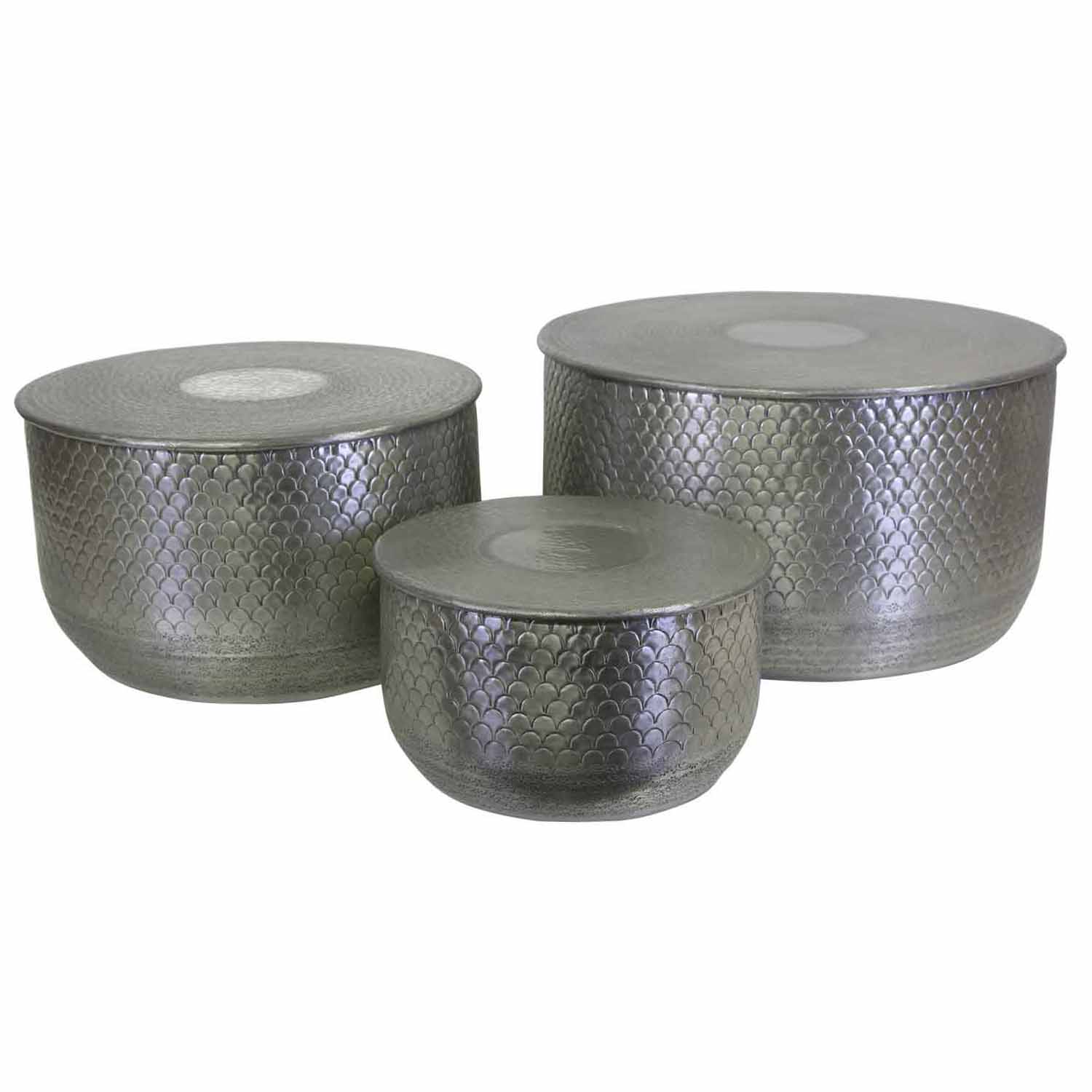 Une table d'appoint Alava argentée en aluminium de très haute qualité, décorée d'ornements orientaux. Un meuble que l'on ne voit pas tous les jours. La table orientale à l'aspect martelé est particulièrement adaptée comme table basse dans le salon, comme table d'appoint dans le bureau ou comme table à narguilé pour votre salon. Cet objet décoratif est un véritable atout et attirera tous les regards dans n'importe quelle pièce. Il peut également être utilisé comme table à fleurs, table à thé, table de chevet, table d'appoint, support pour lampe ou téléphone.