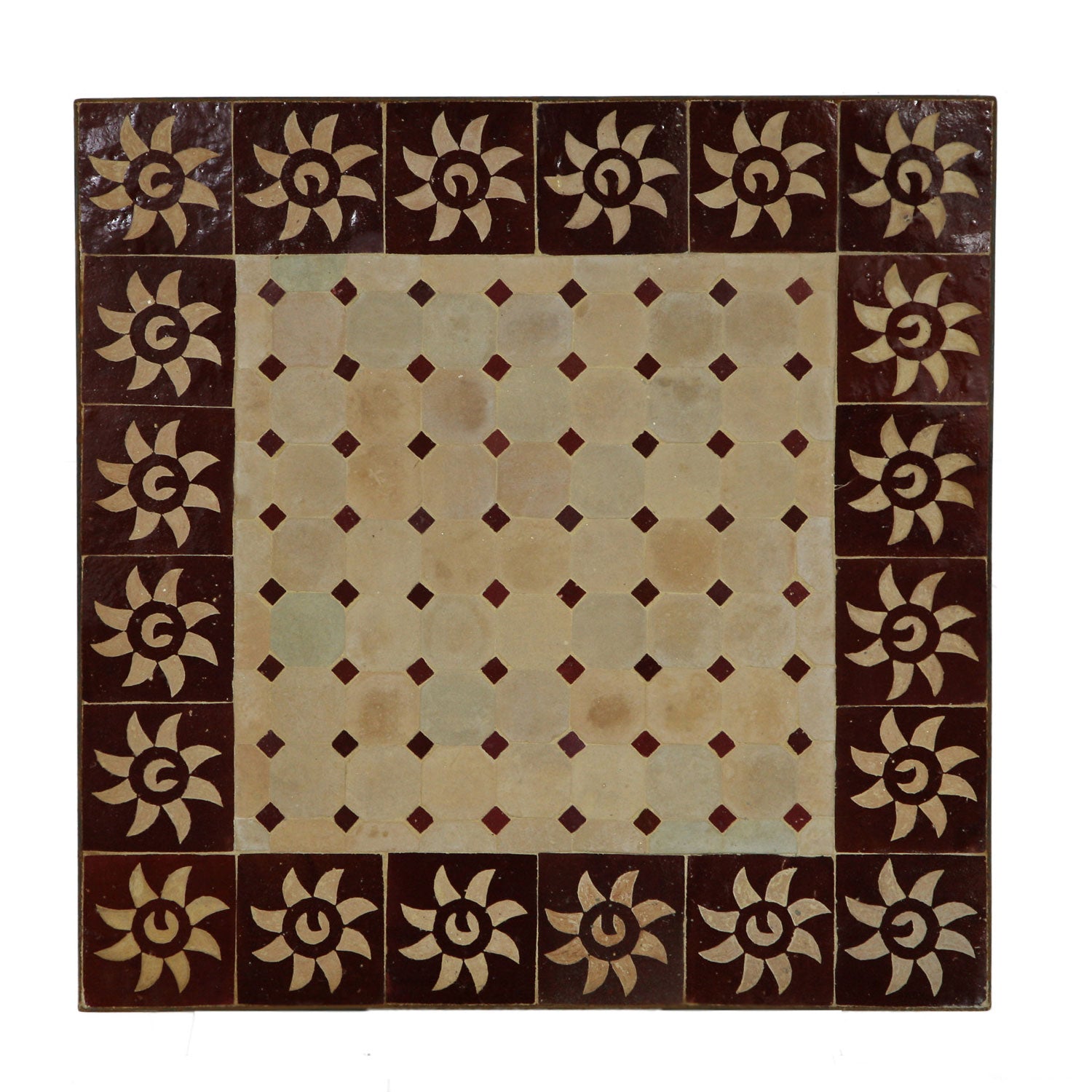 • Mosaïque composée de carreaux Zellige émaillés et de carreaux d'argile non émaillés. Couleur : bordeaux/naturel