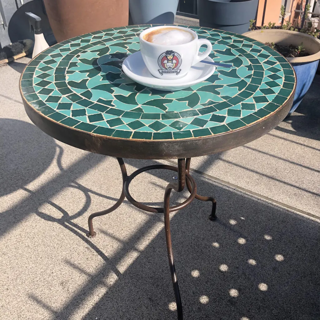 Le plateau en mosaïque d'environ 11 kg repose sans vis sur un piètement en fer forgé finement courbé et recouvert d'un vernis transparent. La table d'appoint est facile à déplacer et peut être utilisée de manière flexible : comme table d'appoint, table pour plantes ou petite table carrelée pour le couloir.