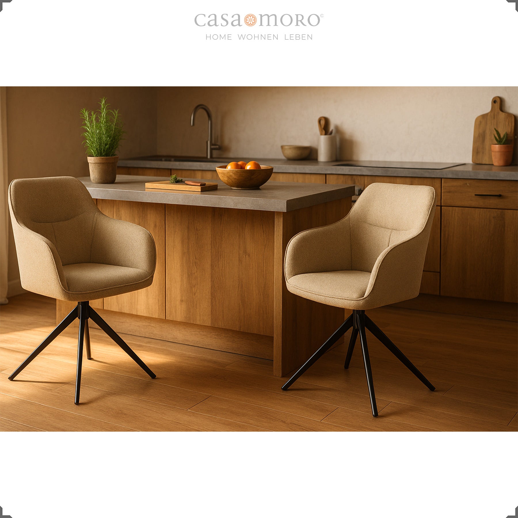 Cette chaise rembourrée avec accoudoirs allie un design élégant à un confort adapté à un usage quotidien. Conçue comme une chaise pivotante à 360° avec un piètement métallique et un dossier pour le salon, la salle à manger, la cuisine ou le bureau, elle s'intègre facilement dans les intérieurs modernes et classiques. La combinaison de couleurs beige et noir est intemporelle, apaisante et en même temps distinctive.