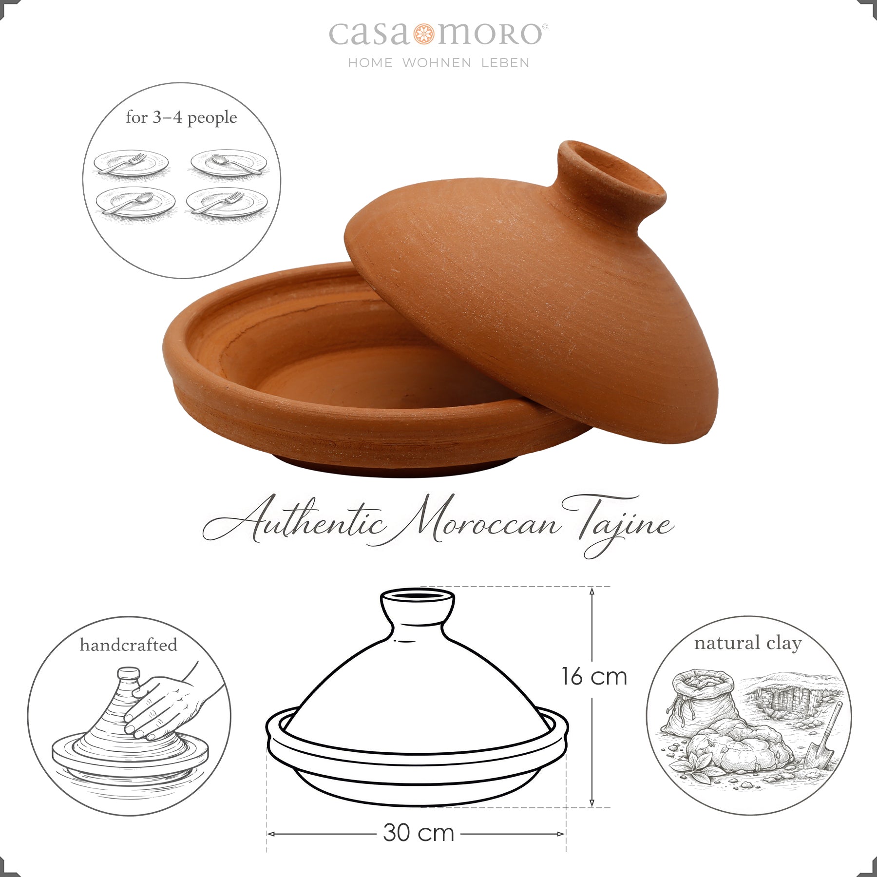 Avec un diamètre de 30 cm c'est Tagine parfait pour 3-4 personnes. Vous disposez de suffisamment d’espace pour des portions généreuses sans que le plat ne « déborde ». Qu'il s'agisse d'agneau aux épices fines, de poisson aux légumes, de poulet aux olives ou de végétarien aux légumineuses, ce format garantit que tout cuit uniformément et que l'arôme reste présent jusqu'au moment de servir.