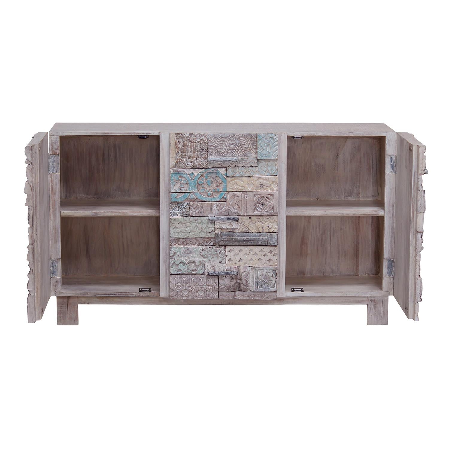 Avec ses 2 portes et ses 3 tiroirs, cette commode offre un grand espace de rangement. L'espace derrière les portes est divisé en deux par une étagère. La combinaison des ornements sculptés à la main et des motifs fantaisistes confère à cette commode un aspect mystérieux et mystique !