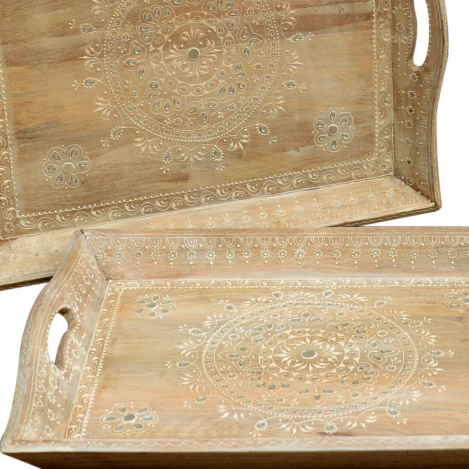 Oosterse ambachtslieden versieren de massief houten dienbladen met filigraan ornamenten en versieren ze gedeeltelijk met glinsterende glassteentjes. De levering in een set is uiterst praktisch. Zo heb je voor elke situatie altijd het juiste dienblad bij de hand. Ook mooi als decoratieobject.