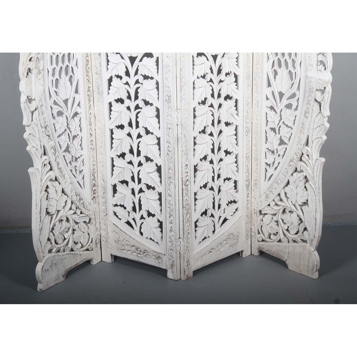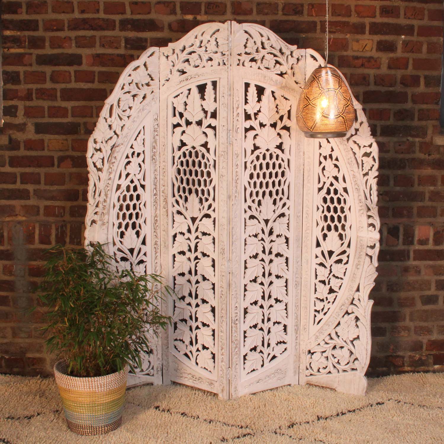 Het Indiase kamerscherm Samrina is met de hand gesneden uit mangohout en MDF en is voorzien van traditionele bloemmotieven. Het bestaat uit vier panelen. Het kamerscherm met zijn elegante witte panelen past bij vrijwel elke interieurstijl. Deze ruimteverdeler is een moderne en elegante oplossing om uw woonruimte naar wens in te delen. Maar ook als decoratie is het kamerscherm een echte blikvanger in uw woning.