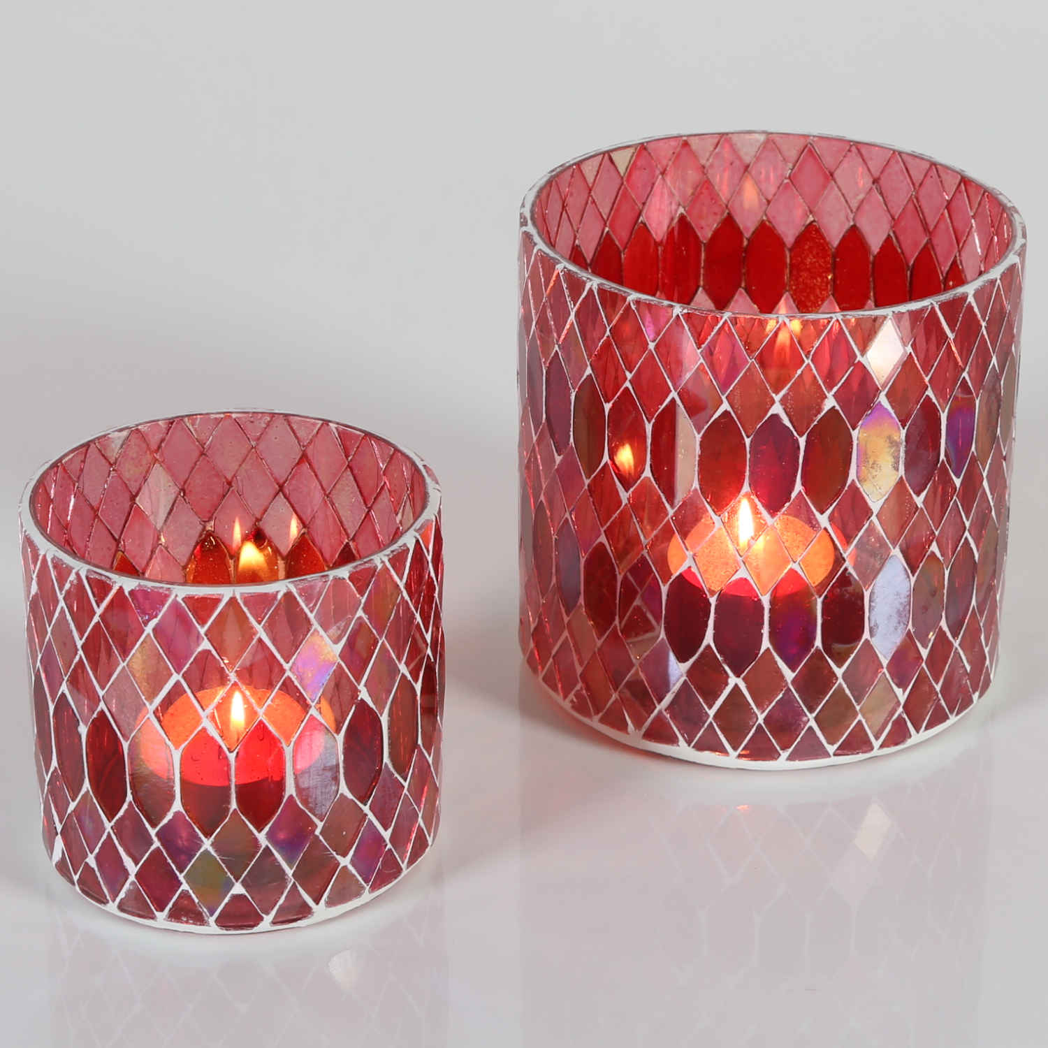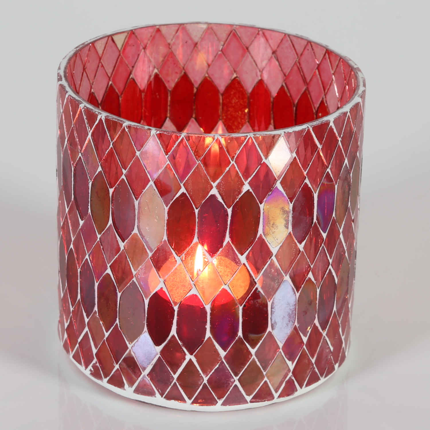 Decoratieve mozaïek glazen windlicht, theelichthouder Rayan rood. De kleurrijke glazen zijn aan de buitenkant met de hand versierd met kleine mozaïekglassteentjes, waardoor elk mozaïek glazen windlicht uniek is. Of het nu in de woonkamer als tafeldecoratie, op het terras als tuinwindlicht, in de slaapkamer als sfeerverlichting of als kandelaar in uw restaurant, hotel of lounge is - de mozaïekwindlichten zorgen altijd voor een sfeervolle atmosfeer en worden een decoratief hoogtepunt dat niemand kan negeren.