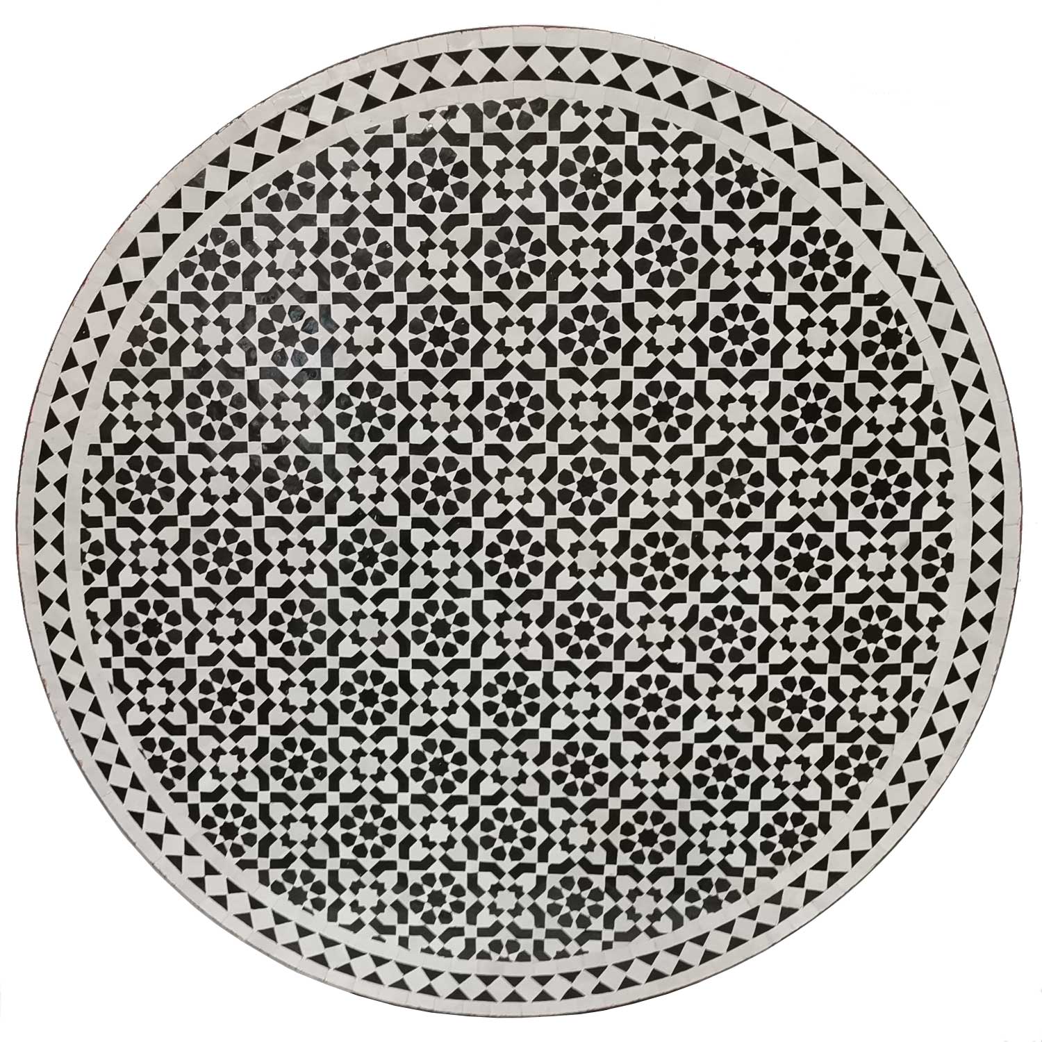 Deze mozaïek laat zien dat een traditioneel vervaardigde mozaïek eettafel helemaal niet kleurrijk hoeft te zijn. De kleuren zwart en wit hebben een groot voordeel: ze passen altijd. Deze geglazuurde mozaïektafel komt het best tot zijn recht in een moderne omgeving, zoals een loft, een balkon met veel roestvrij staal en een terras met graniet of natuursteen. Of kies hem als rustpunt naast rood en andere sterke kleuren. Het ornament is echter allesbehalve subtiel: omlijst door een ruitvormige rand, wemelt het binnenin van de banden, vijfhoeken en sterren.