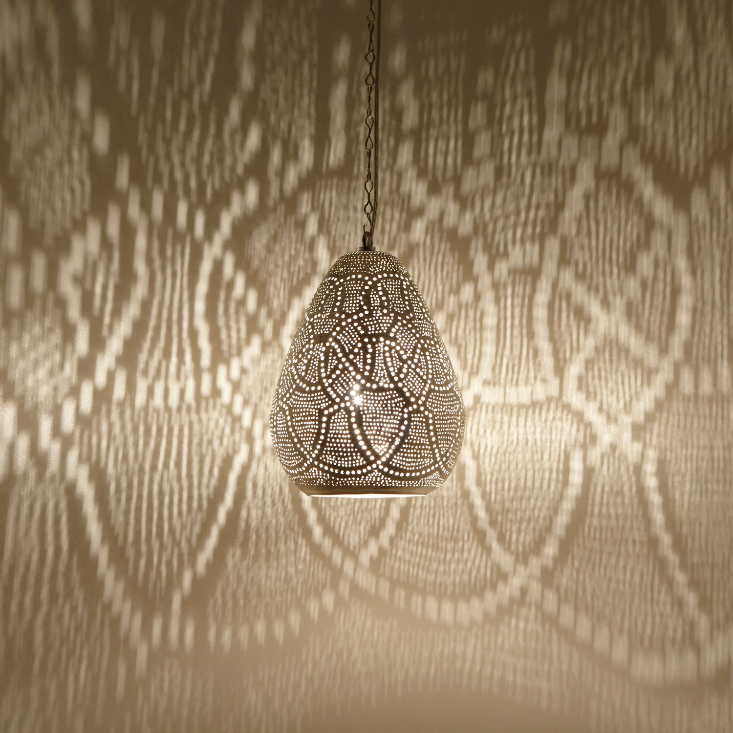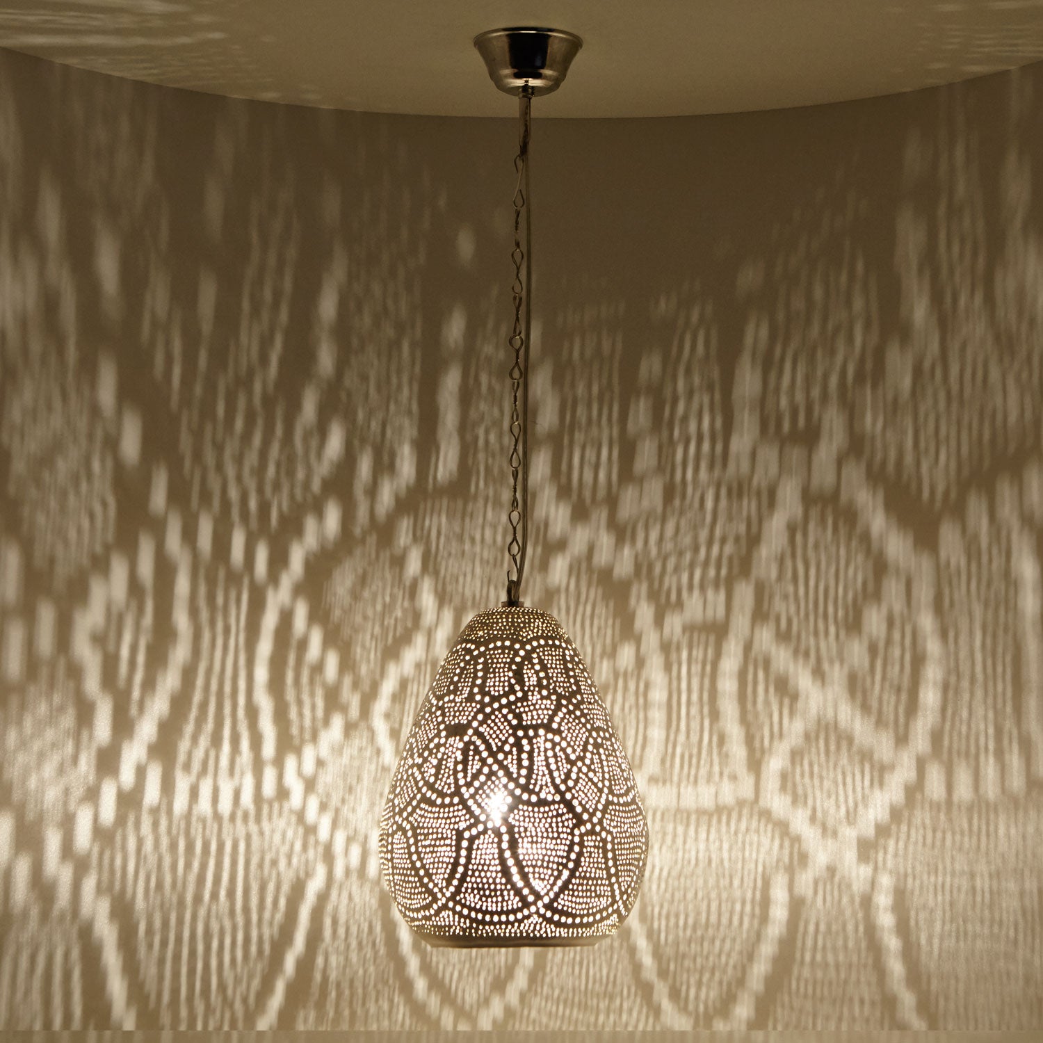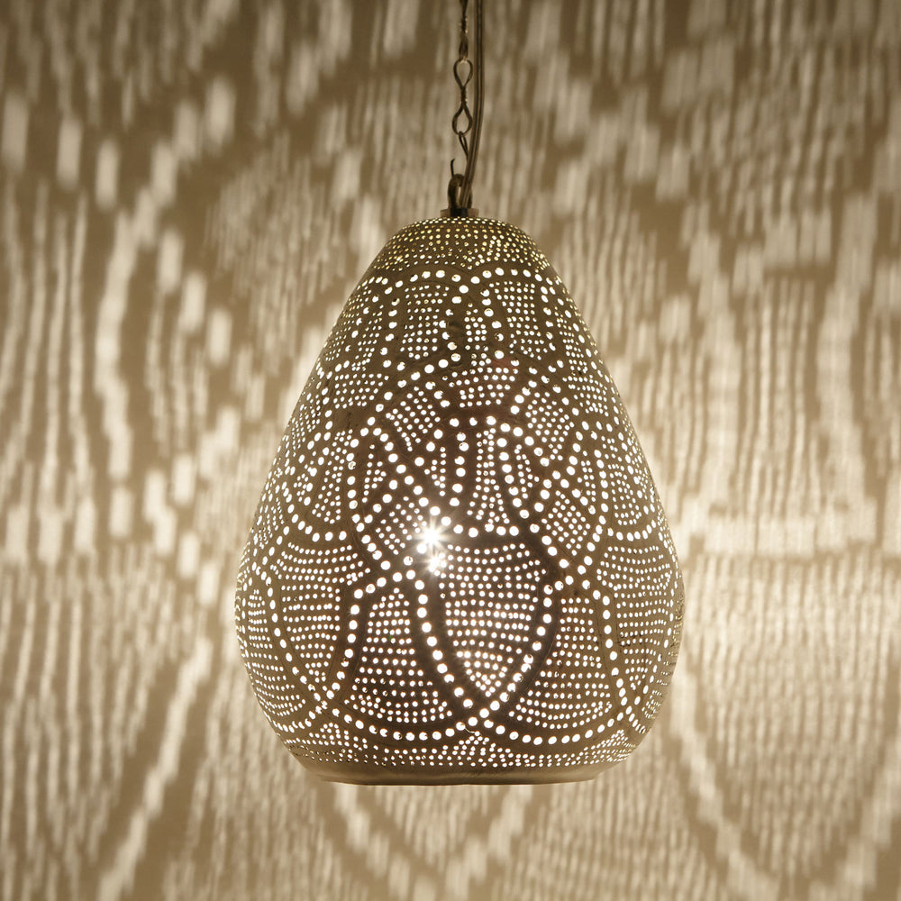 De hanglamp zorgt met zijn betoverende schaduwen voor een gezellige sfeer in elke hoek en elke kamer! Of het nu boven de eettafel, in de slaapkamer of woonkamer is, of het nu mediterraan, oosters of modern is – met onze verzilverde Egyptische lamp gaat u op reis naar het Oosten en laat u zich betoveren door filigrane schaduwen – een blikvanger die niet mag ontbreken in uw woonkamer!