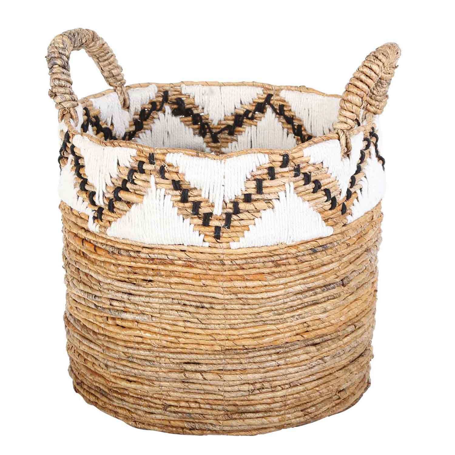 De robuuste natuurlijke manden zijn aan de onderkant plat en daardoor zeer stabiel. Ze zijn voorzien van twee handvatten, waardoor ze gemakkelijk te vervoeren zijn. Gebruik 'Raja' met rand bijvoorbeeld als decoratieve wasmand. Door het kunstzinnig verwerkte patroon van witte en zwarte katoenen draden wordt het een mooie blikvanger in uw badkamer.