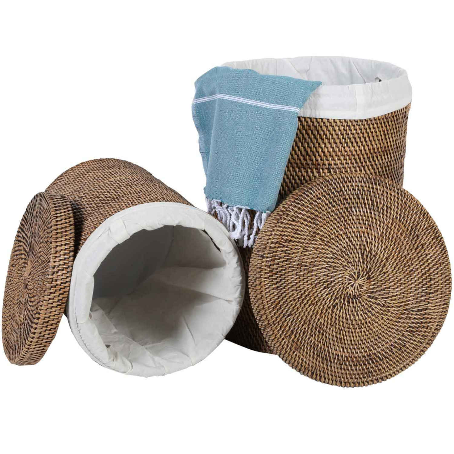 De rieten wasmand Cleo Bruin met afneembaar deksel is handgeweven van 100% natuurlijk riet, zodat u een milieuvriendelijke opbergmogelijkheid heeft. Deze rustiek gevlochten manden zijn natuurlijk, mooi, robuust en dus ideaal voor opslag en decoratie. De ronde rotan wasmand biedt voldoende ruimte om uw vuile was netjes op te bergen. Het kunstzinnige vlechtpatroon van onze rotan wasmanden in natuurtinten geeft elke ruimte een mediterrane sfeer en zal gegarandeerd de aandacht trekken. De binnenkant van de wasmand is bekleed met uitneembaar katoen en dankzij de geïntegreerde handvatten kunt u de rotanmand gemakkelijk van kamer naar kamer dragen.