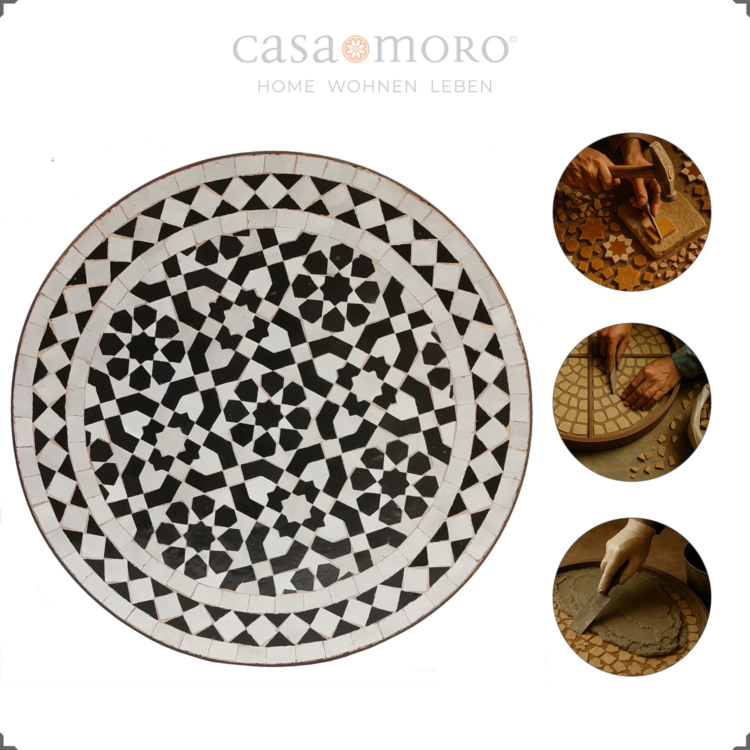 Een kleine ronde tuintafel van 45 cm die met zijn grafische zwart-witte mozaïek elke ruimte helderheid en uitstraling geeft. Het traditionele Marokkaanse patroon in Zellige-techniek oogt modern en tijdloos tegelijk – ideaal voor het terras, de woonkamer of het balkon.