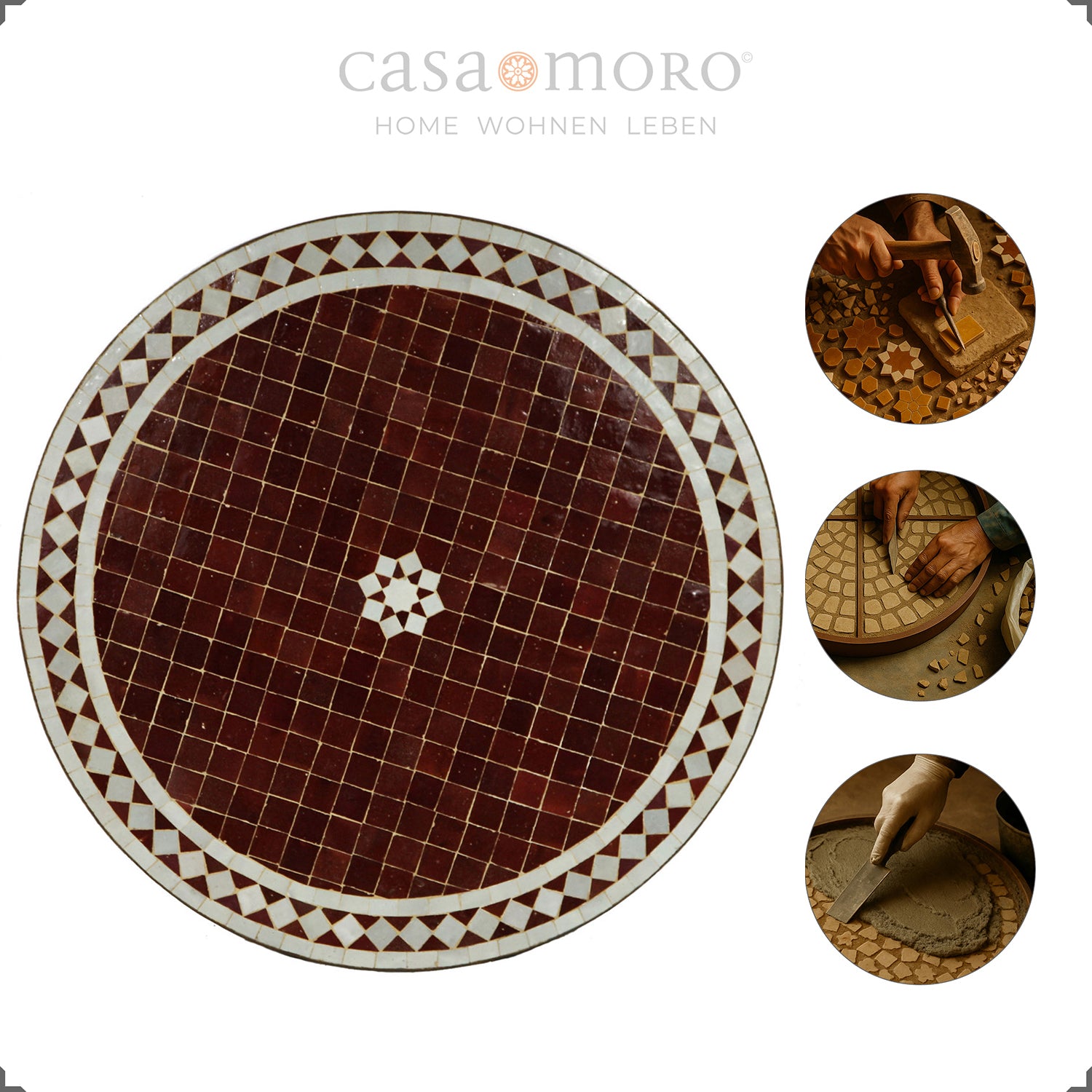 Een stijlvolle tuintafel voor twee personen, die met zijn traditionele Zellige-mozaïek in rijk bordeauxrood en wit de charme van Marokkaans vakmanschap weerspiegelt. Het stervormige midden en het rechtlijnige ruitpatroon maken hem tot een decoratief middelpunt op het terras, balkon of in de eetkamer.