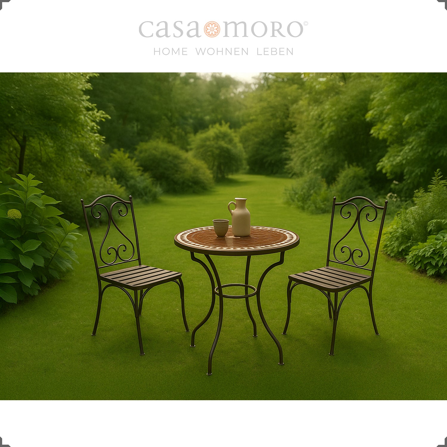 Het ongeveer 18 kg zware mozaïekblad ligt stabiel op het fijn gebogen smeedijzeren frame – zonder schroeven, flexibel te plaatsen. Of het nu als salontafel, balkontafel of elegante bistrotafel wordt gebruikt: dit meubelstuk brengt structuur en kleur in zowel klassieke als moderne woonconcepten.
