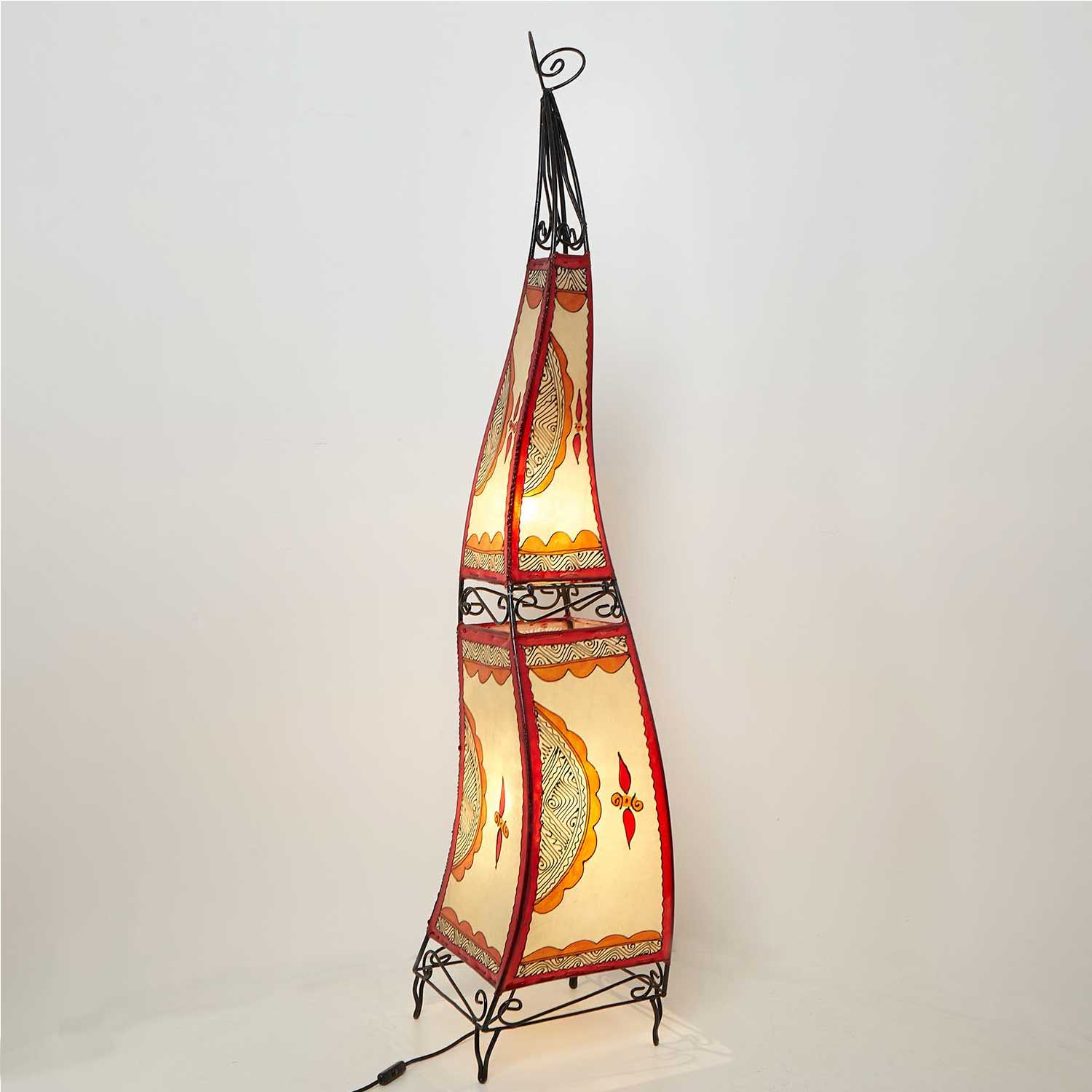 Lampframe van handgesmeed ijzer, bekleed met echt geitenleer, genaaid en vervolgens kunstzinnig beschilderd met prachtige henna-ornamenten.